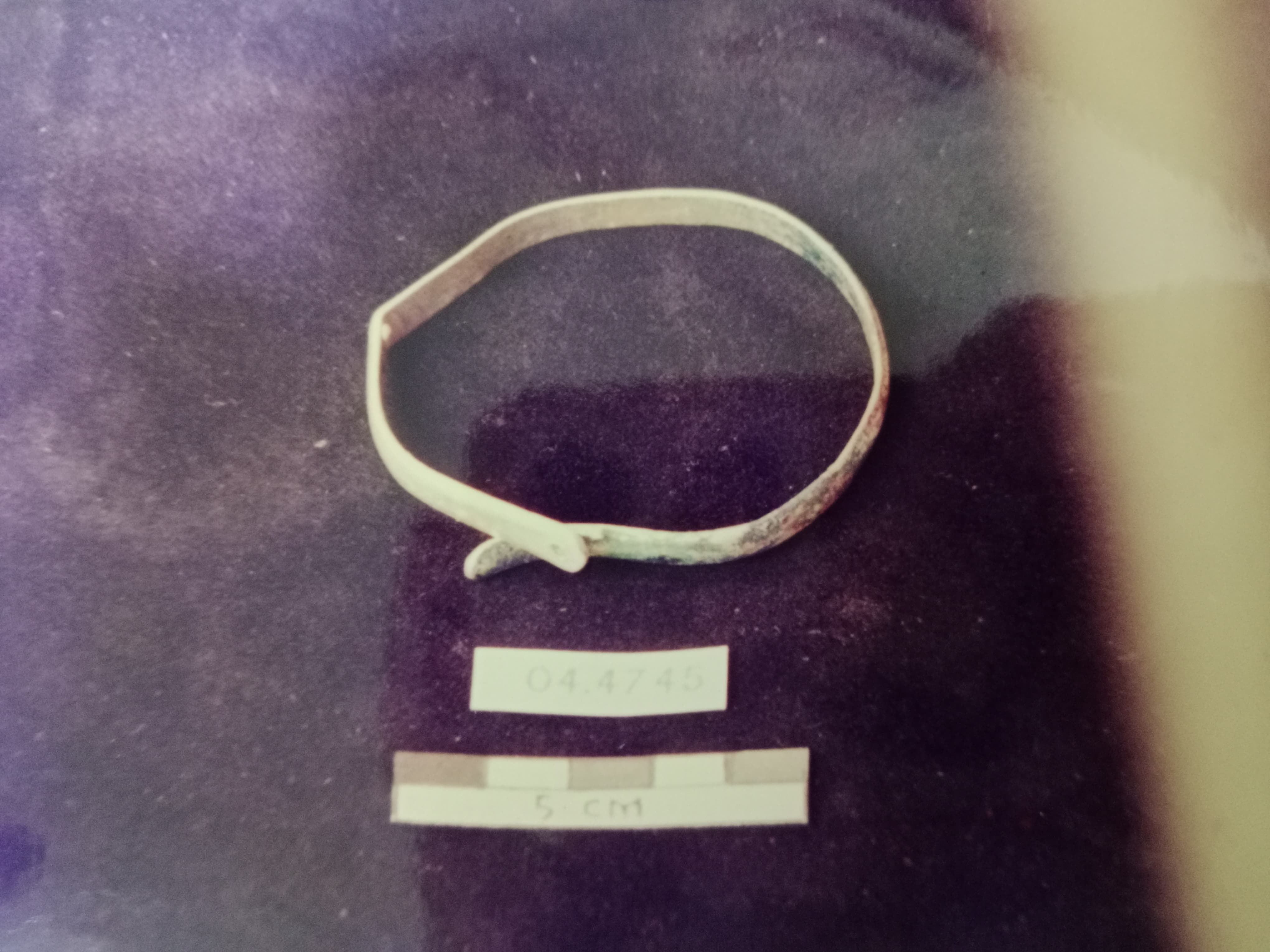Berbahan perak, berbentuk bulat melingkar, pada kedua ujung berbentuk tangan terdapat dua garis meligkar
