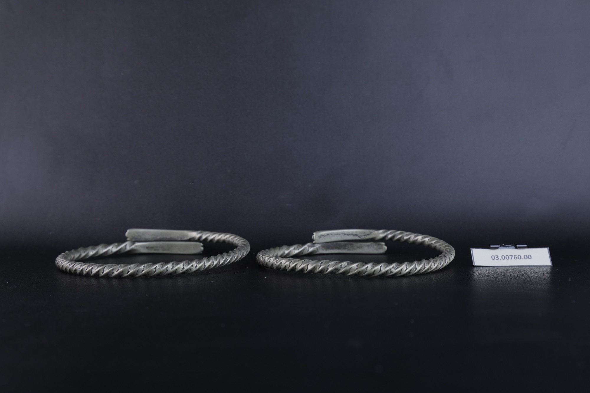 sepasang gelang kaki terbuat dari perak, hiasan motif pilin tali, kedua bagian ujung agak pipih dan saling bertindih, dengan hiasan motif garis-garis dan bola-bola. gelang kaki ini biasa dipakai untuk pelengkap pakain adat.
