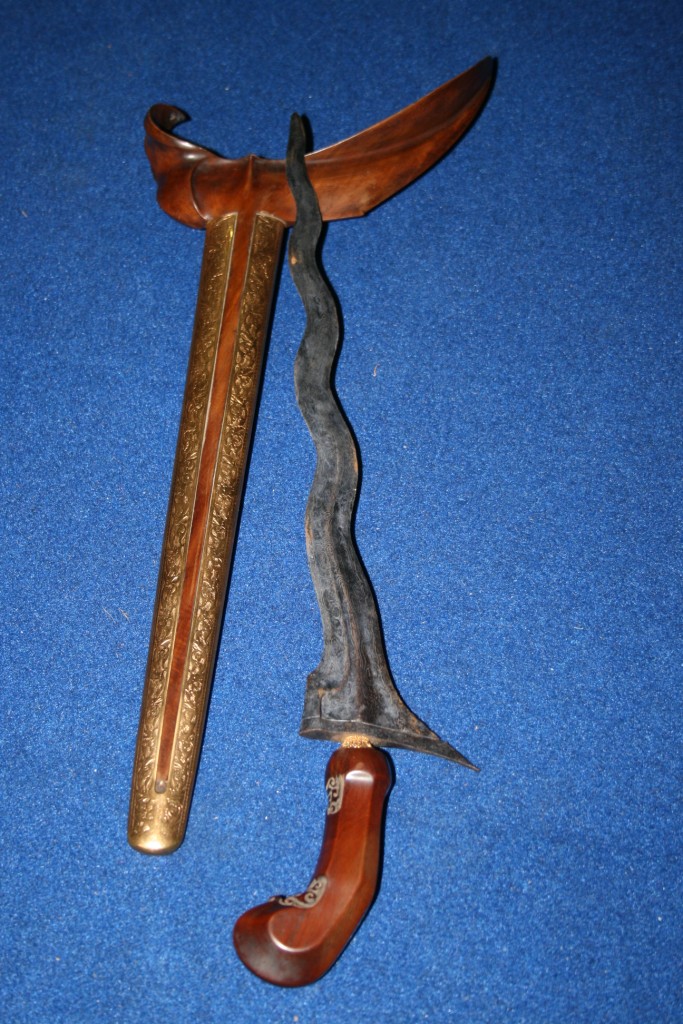 Bentuk bundar, melingkar, berongga. Motif tumpal (gigi haruan). Di bagian tengah (sisi samping) benda berongga. Dibagian dalamnya terdapat 4 (empat) butiran kerikil. Merupakan kelengkapan tarian penggiring pada upacara adat.