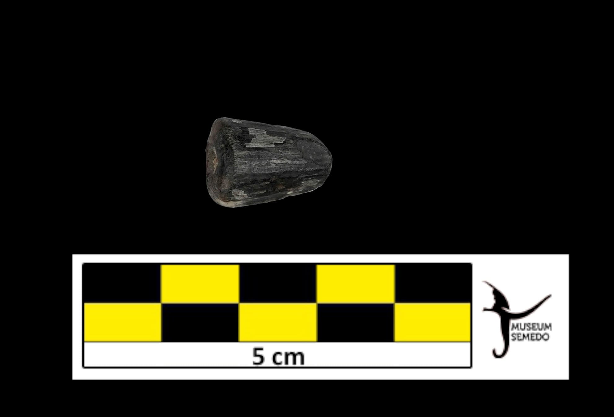 Koleksi merupakan bagian gigi dari buaya. Secara umum, koleksi berada dalam kondisi baik. Permukaan koleksi didominasi oleh warna hitam keabuan dan salah satu sisinya berwarna kecoklatan. Koleksi gigi ini berbentuk meruncing, meskipun demikian pada bagian ujungnya (apex) tidak begitu runcing melainkan cenderung tumpul. Pada bagian pangkal gigi (root) terdapat lubang. Carinae terlihat samar sedangkan guratan apicobasal masih terlihat cukup jelas.