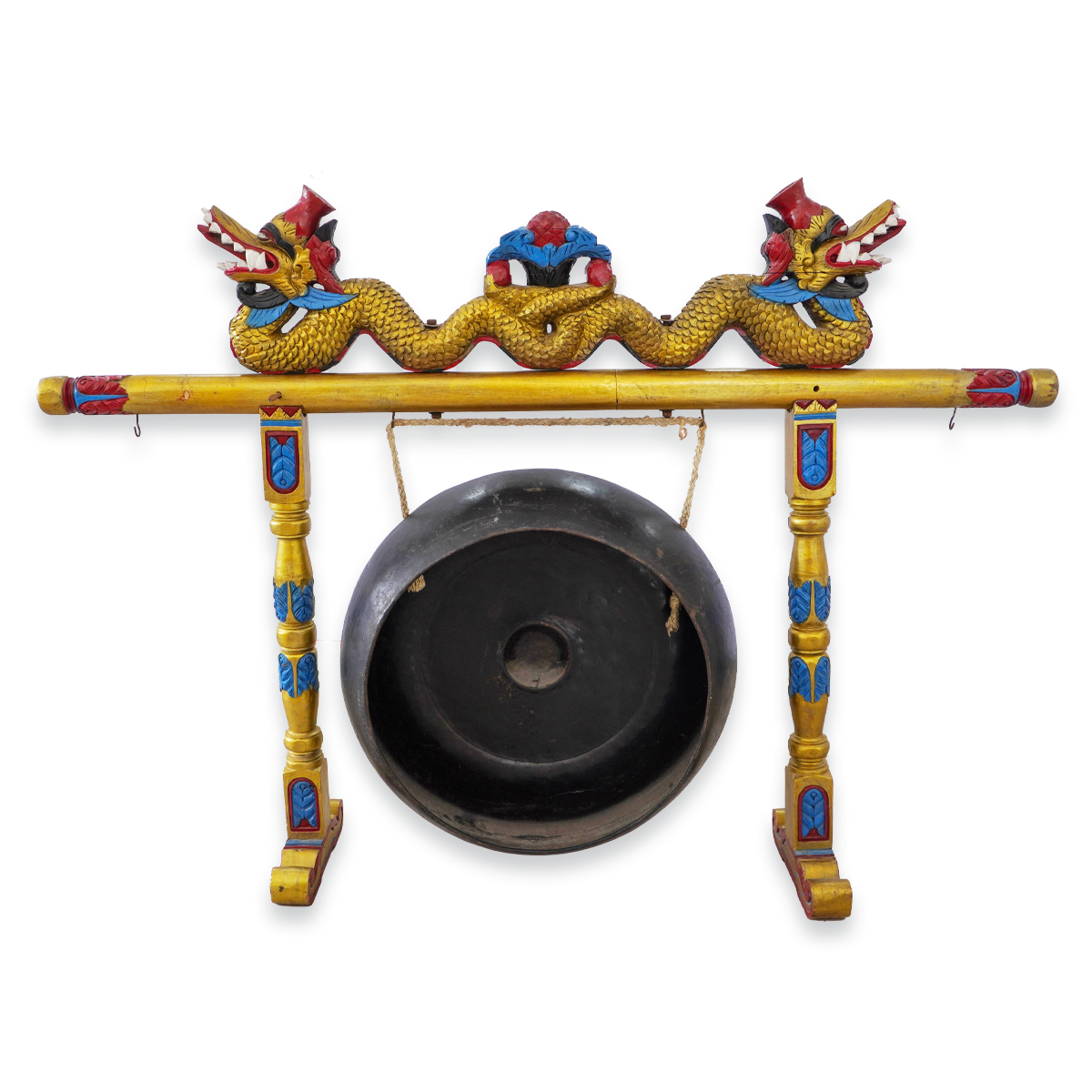 Gong Jawa ini merupakan salah satu instrumen utama dalam perangkat gamelan. Terbuat dari perunggu berbentuk bundar dengan tonjolan di bagian tengah (disebut pencon), gong berfungsi sebagai penanda akhir frase atau gong ageng dalam komposisi gamelan. Gong digantung pada rancakan (kerangka kayu) berwarna emas dengan ukiran dan hiasan naga bermotif tradisional Jawa, dicat dalam kombinasi warna merah, biru, dan emas yang mencolok. Motif naga melambangkan kekuatan, penjaga, serta simbol sakral dalam tradisi Jawa.