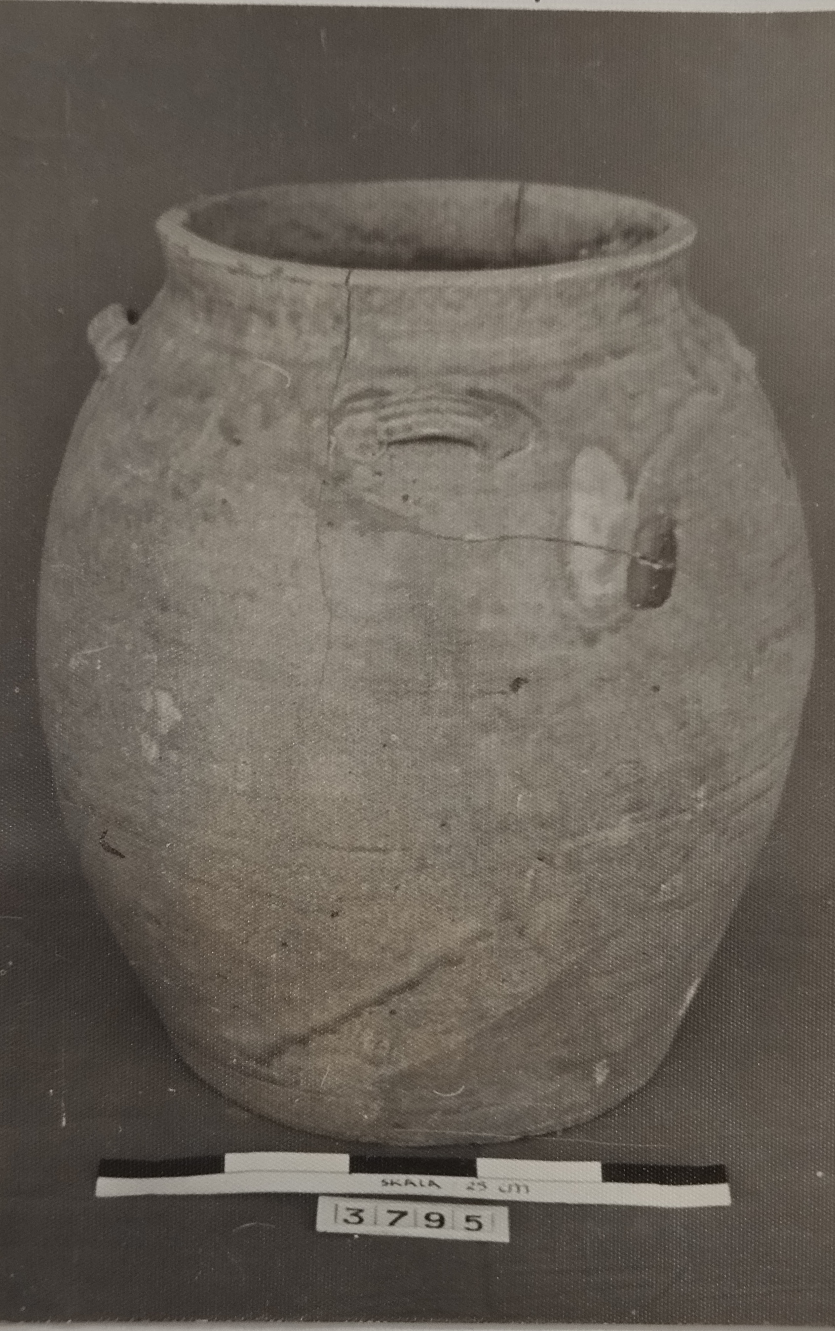 Terbuat dari campuran tanah liat dan batuan, bentuk bulat lonjong menyerupai botol, leher rendah, mulut kecil dengan bibir membalik keluar, berglasir warna coklat kehtaman. Pada pundak terdapat dua buah telinga vertikal dan beralur-alur tippis melingar. Bagian badan bawah dan dasar tidak diglasir. Thailand, abad 14 - 15 M.