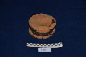 Bahan terbuat dari kain warna merah dan manik-manik warna merah, biru, dan jingga. Benda ini berbentuk kopiah pendek dengan hiasan bermotif ular (naga) dengan bagian belakang disambung dengan dua buah karet agar terikat dengan kuat pada kepala. Benda ini berasal dari Palangka Raya yang digunakan kaum Wanita Dayak Ngaju sebagai hiasan penutup kepala (topi) bagi para penari wanita dalam tradisi Dayak Ngaju.