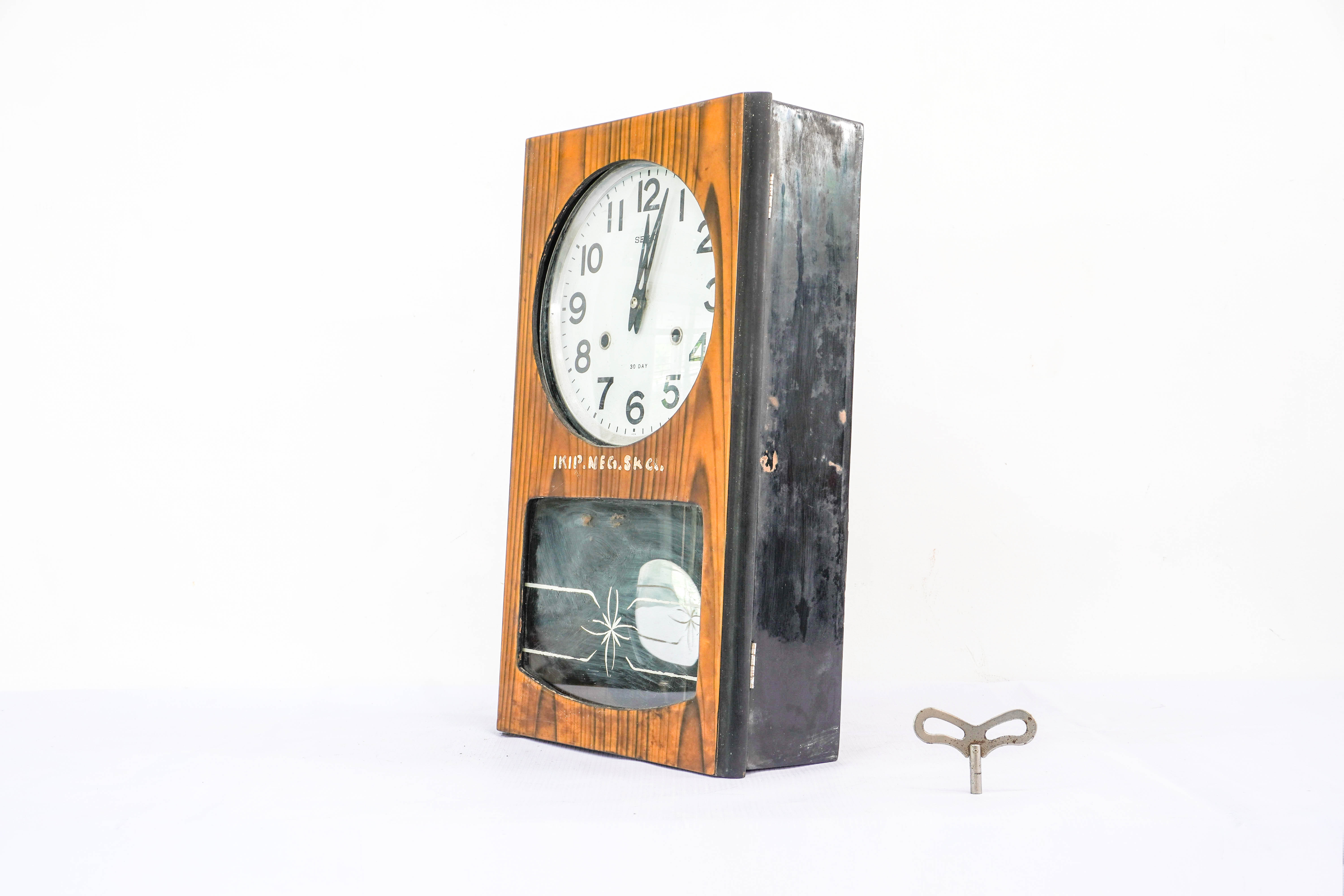 Koleksi ini berupa jam dinding mekanik berbentuk persegi panjang dengan badan kayu berwarna cokelat bermotif serat alami. Bagian atas menampilkan penunjuk waktu berbentuk lingkaran dengan latar putih dan angka hitam dari 1 hingga 12. Jarum jam berwarna hitam, sedangkan penutupnya dilindungi kaca bening. Pada bagian bawah terdapat ruang kaca transparan berbentuk persegi kecil yang memperlihatkan bandul logam berbentuk lingkaran dengan ukiran motif bunga. Tulisan “IKIP NEG. SKC.” tercetak di bagian depan badan kayu. Jam ini dilengkapi kunci besi kecil untuk memutar mekanisme penggeraknya. Kondisi kayu masih kokoh meski terdapat goresan halus, sementara kaca depan tetap utuh.