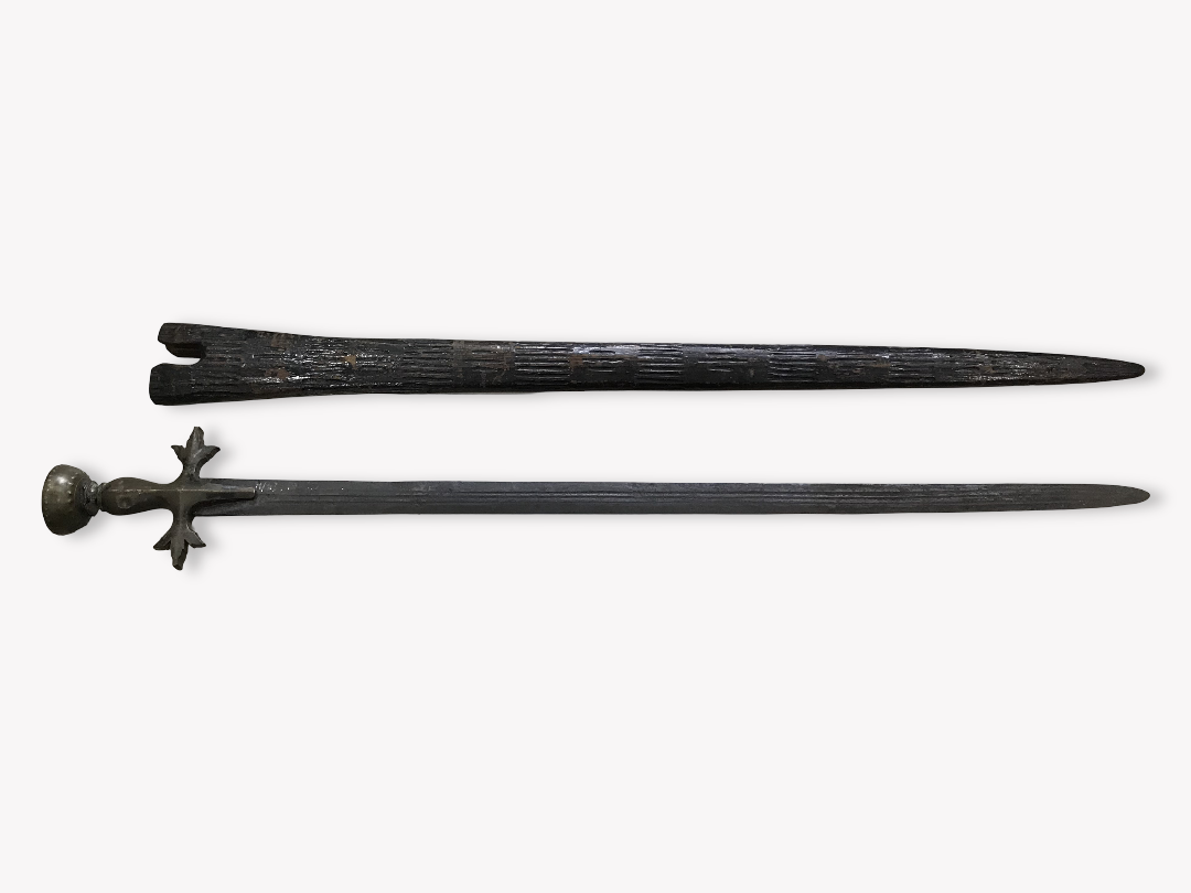 Mata Jenawi beserta ulunya terbuat dari besi dan sarungnya dari kayu. Panjang dengan mata pipih semakin keujung semakin meruncing. Jenawi ini mempunyai ulu/gagang yang menyerupai salib sedangkan sarungnya juga bebrbentuk panjang dan pipih. Pada bahagian sarungnya terdapat hiasan yang bermotifkan garis-garis horizontal. SEbagai senjata. Jenawi ini dipergunakan oleh tentara Portugis dalam abad XVI sebagai senjata dalam berperang dengan menunggang kuda serta menggunakan perisai.