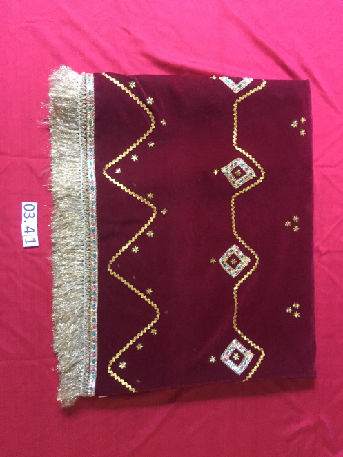 Kain beludru lebar berwarna merah hati yang terbuat dari bahan serat padat dan rapat dihiasi dengan tempelan manik-manik berwarna emas. Hiasan manik-maniknya berbentuk geomehalntri dan bunga. Selain manik-manik, pinggiran kain juga dihiasi dengan rumbai berwarna emas. Kain ini digunakan sebagai penutup bagian atas kero/atap kero/tempat tidur yang di pasang diatas kero/tempat tidur kamar Saleh Sutan Sinaro (Paman Moh Hatta) yang merupakan seorang pengusaha di bidang pengantaran barang pos, menjalankan usaha dari orang tuanya yang lebih dikenal panggilan pak gaek dan merupakan kamar dengan atribut tempat tidur mewah dibandingkan kamar lainnya. Kain beludru pertama kali ditemukan pada abad ke-14, banyak sejarahwan menyakini bahwa kain ini berasal dari kawasan Asia Timur sebelum merintis “jalur sutra” hingga benua Eropa. Beludru tradisional terbuat dari serat sutra murni, katun atau wol sehingga menghasilkan kain dengan permukaan mengkilap terlihat mewah dan elegan. Namun kini sudah banyak kain beludru yang terbuat dari serat-serat buatan seperti polyester dan nilon.