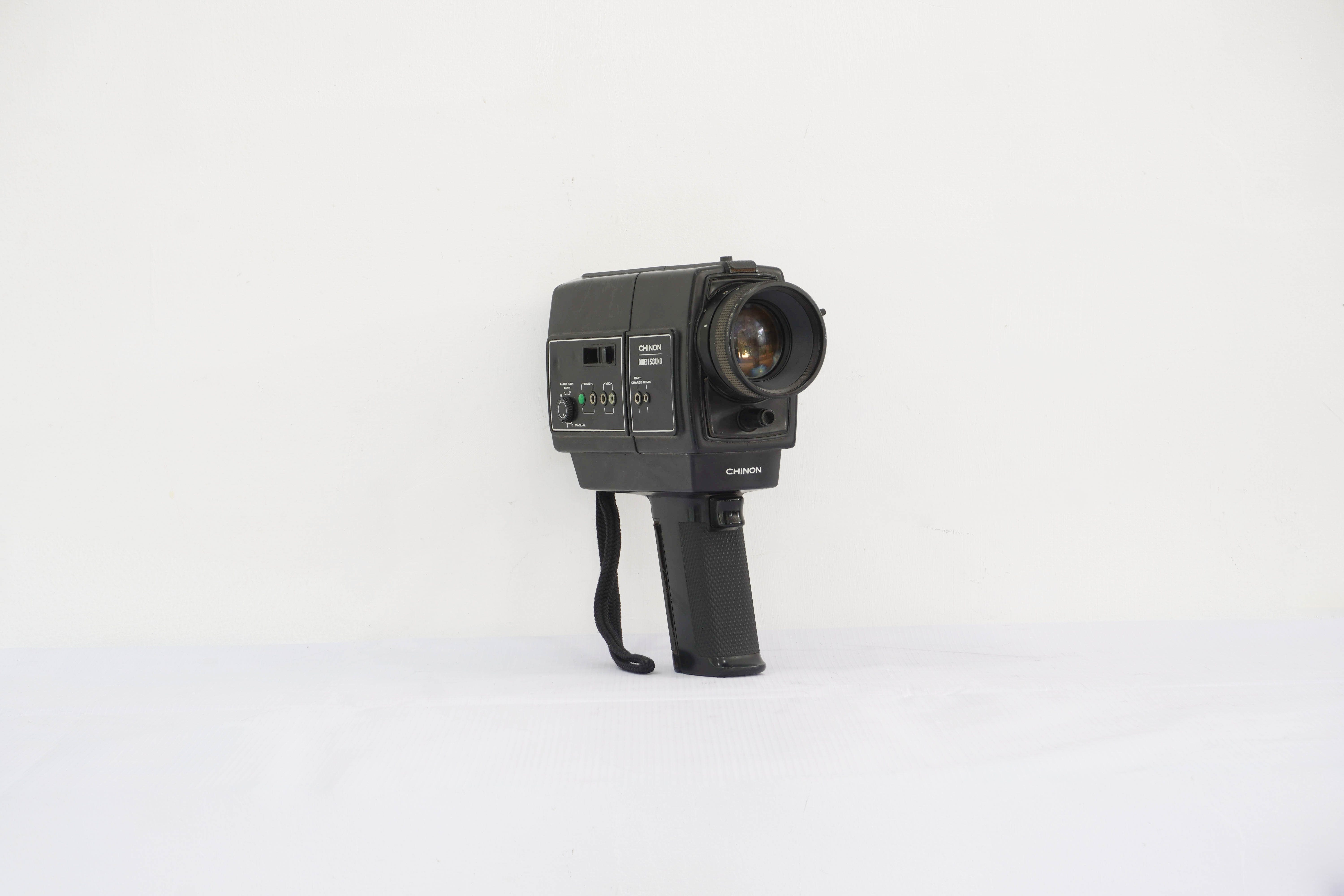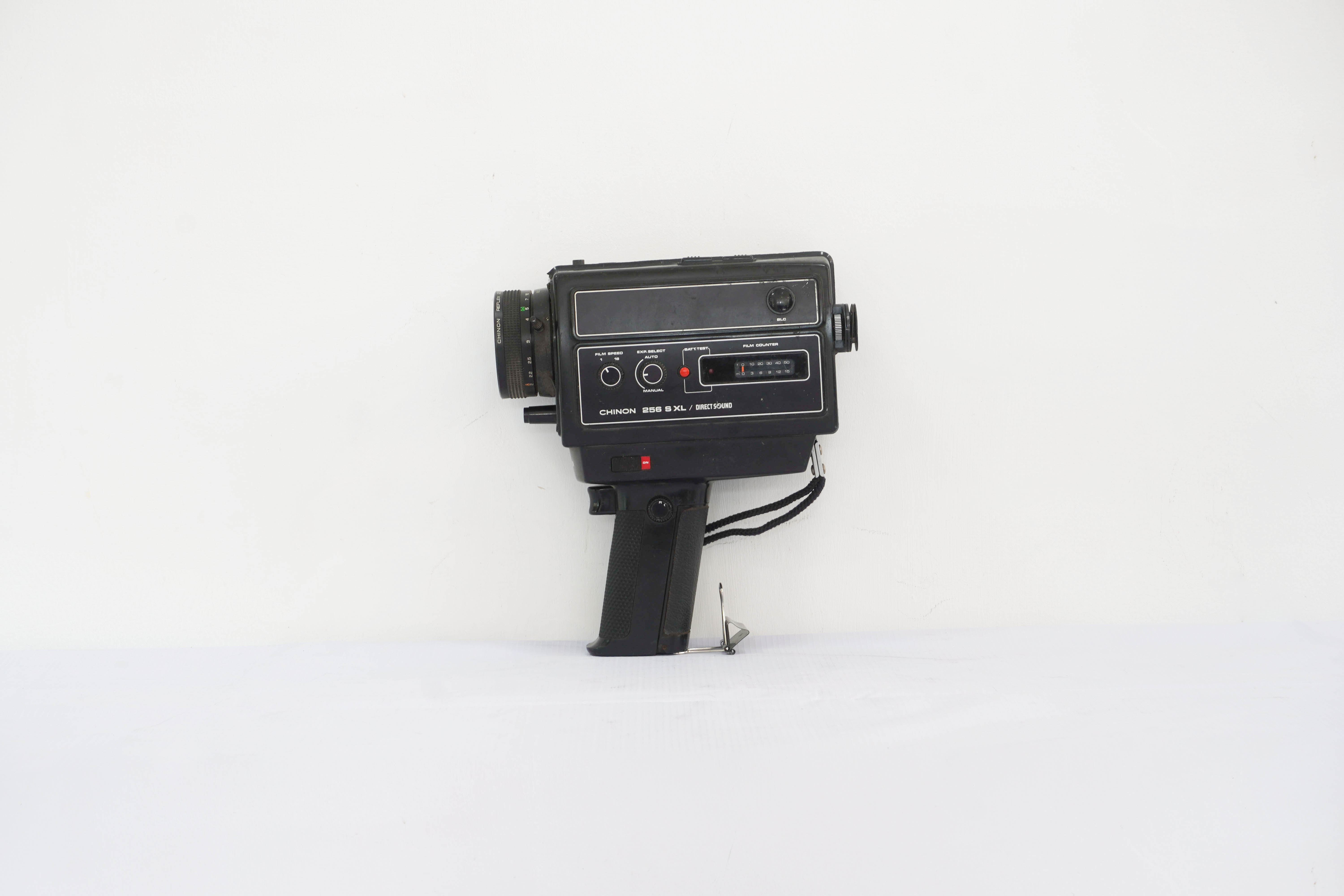 Video kamera merek Chinon 255 S XL Direct Sound ini memiliki desain berbentuk kotak dengan pegangan pistol di bagian bawah. Bodi berwarna hitam dengan panel kontrol sederhana berupa tombol putar dan indikator cahaya di sisi samping. Lensa menonjol di bagian depan, dilengkapi cincin pengatur fokus dan zoom manual. Kamera ini juga dilengkapi tali pergelangan untuk memudahkan penggunaan. Kondisinya menunjukkan tanda pemakaian lama, namun komponen utama masih utuh dan jelas.