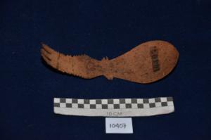 Kapak penetak dengan bentuk tidak beraturan yang berwarna merah kecokelatan. Berbahan batu dan berasal dari periode paleolitik
