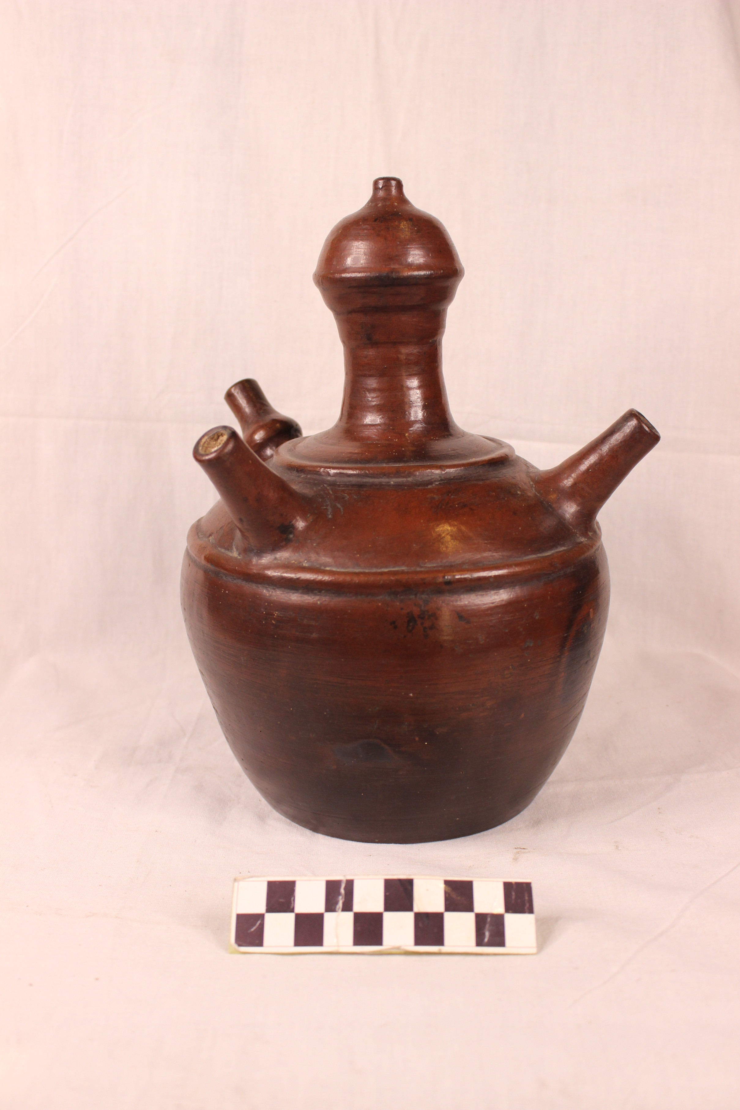 Objek ini merupakan kendi yang memiliki 3 buah cerat dengan permukaan polos tanpa motif hias tertentu. Kendi ini terbuat dari tanah liat atau keramik dan sering kali digunakan dalam budaya Indonesia, terutama dalam konteks tradisional dan upacara tertentu. Kendi ini memiliki fungsi sebagai wadah minuman dan sebagai alat dekorasi tradisional