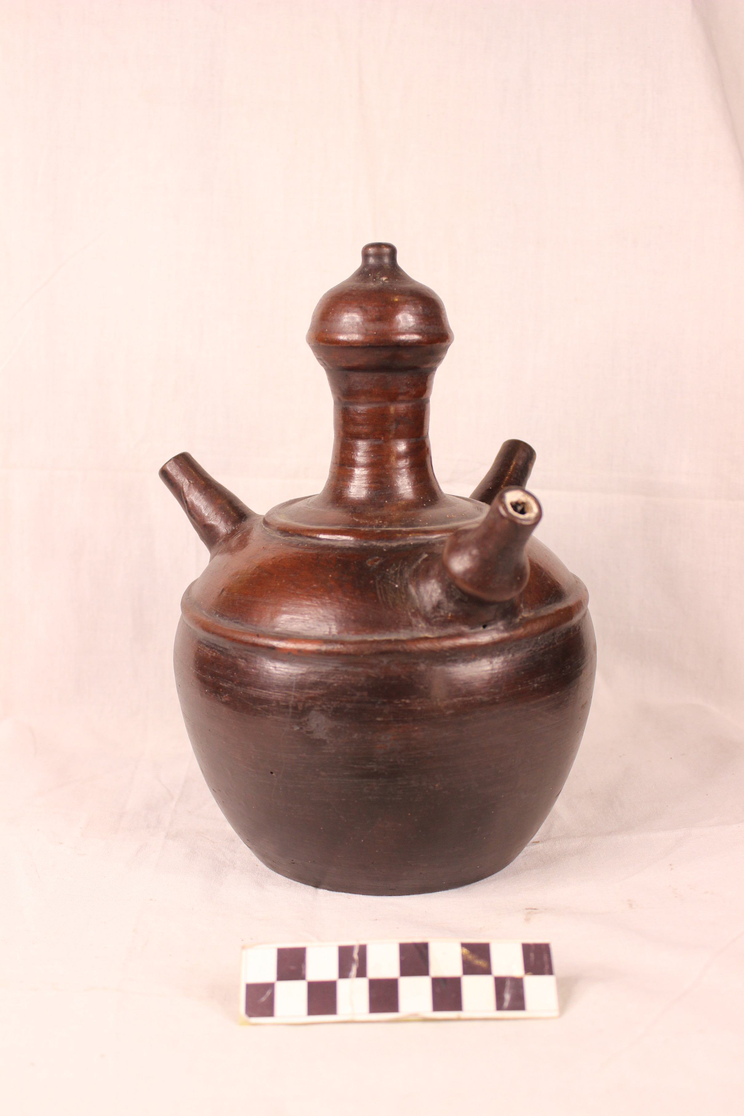 Objek ini merupakan kendi yang memiliki 3 buah cerat dengan permukaan polos tanpa motif hias tertentu. Kendi ini terbuat dari tanah liat atau keramik dan sering kali digunakan dalam budaya Indonesia, terutama dalam konteks tradisional dan upacara tertentu. Kendi ini memiliki fungsi sebagai wadah minuman dan sebagai alat dekorasi tradisional
