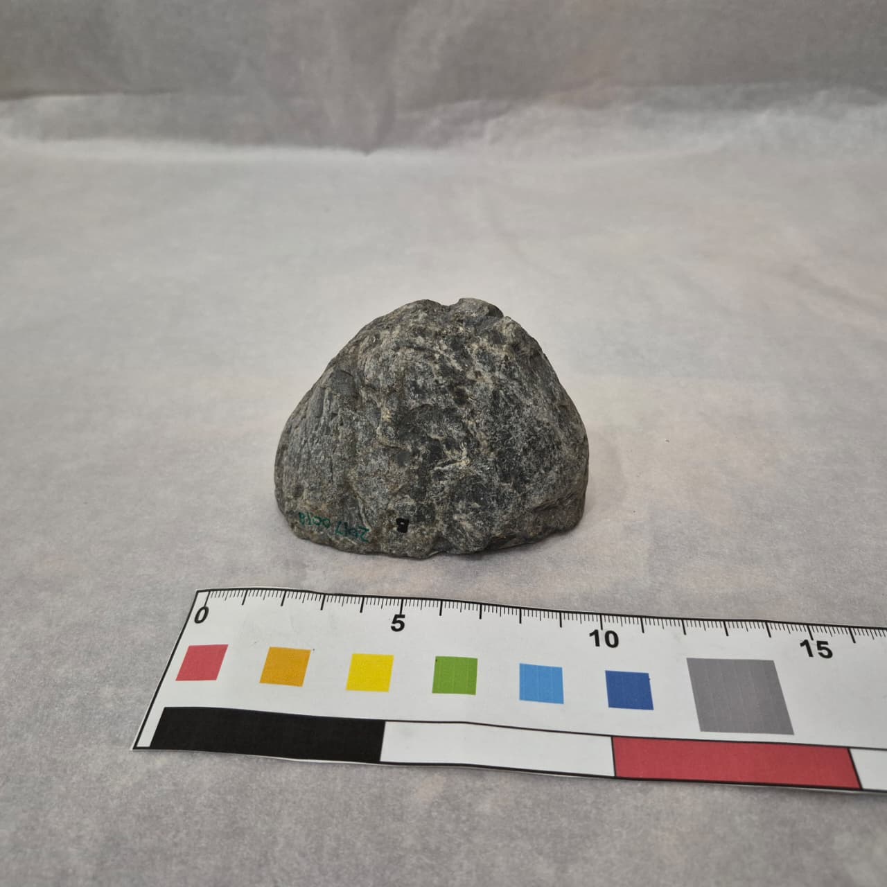 Warna putih buram bahan porcelin motif luar polos kondisi Utuh, glasir terkorosi endapan garam. Telah diberi label sesuai dengan label kotak ekskavasi saat ditemukan BSY/BL/IA/Lot 1/58