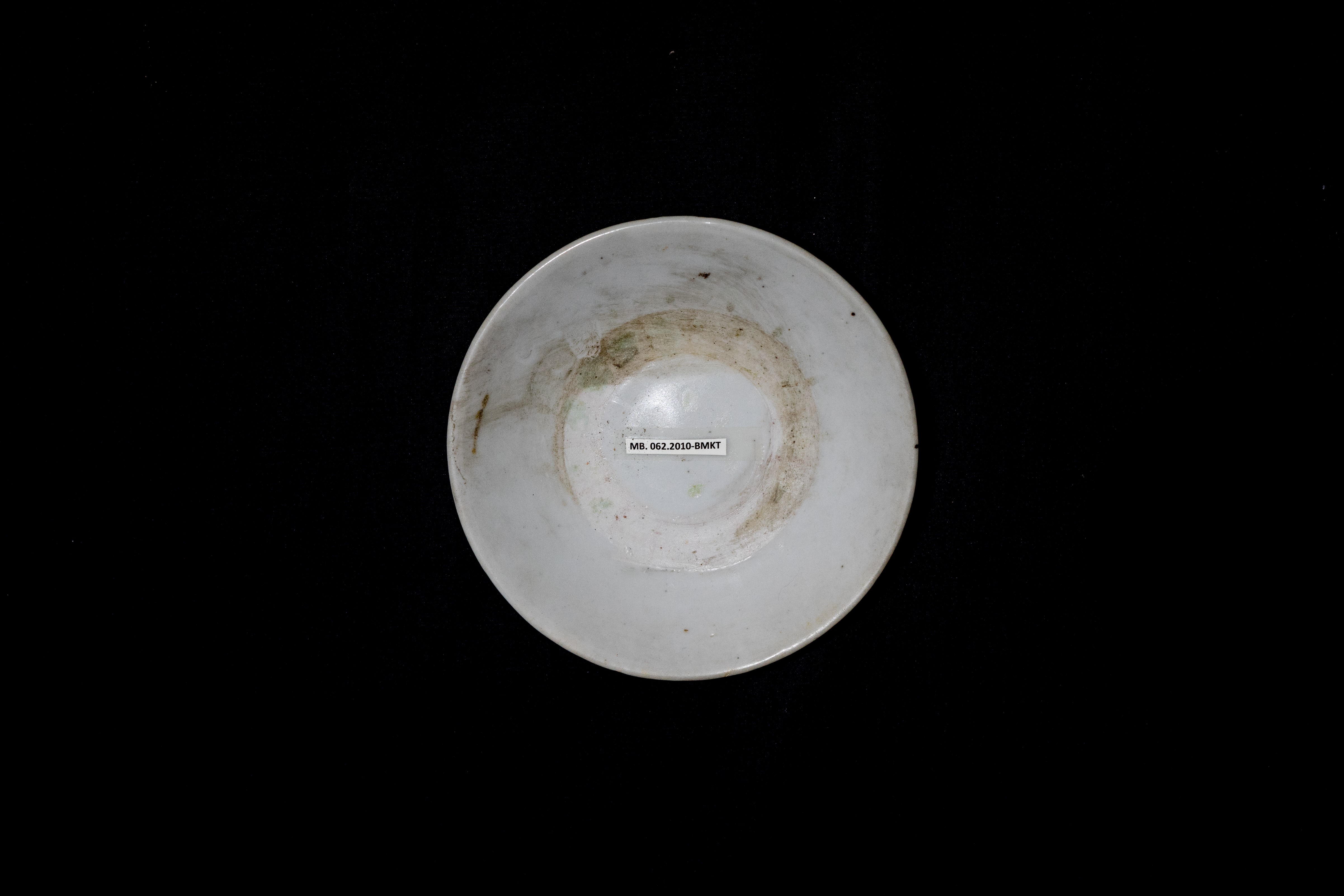 Benda ini dibuat dari bahan kaolin. Berbentuk setengah bulatan mengecil kebawah, berkaki, bibir mengarah keluar. Tepi bibir luar dan pantat kebawah terdapat hiasan ban melingkar warna biru tua demikian juga bagian alas dalam. Hiasan 2 ban melingkar warna biru tua terdapat pada kaki. Sisi luar badan terdapat hiasan berupa sapuan garis-garis agak berjarak dan daun dengan posisi tidak beraturan. Berfungsi sebagai peralatan minum.