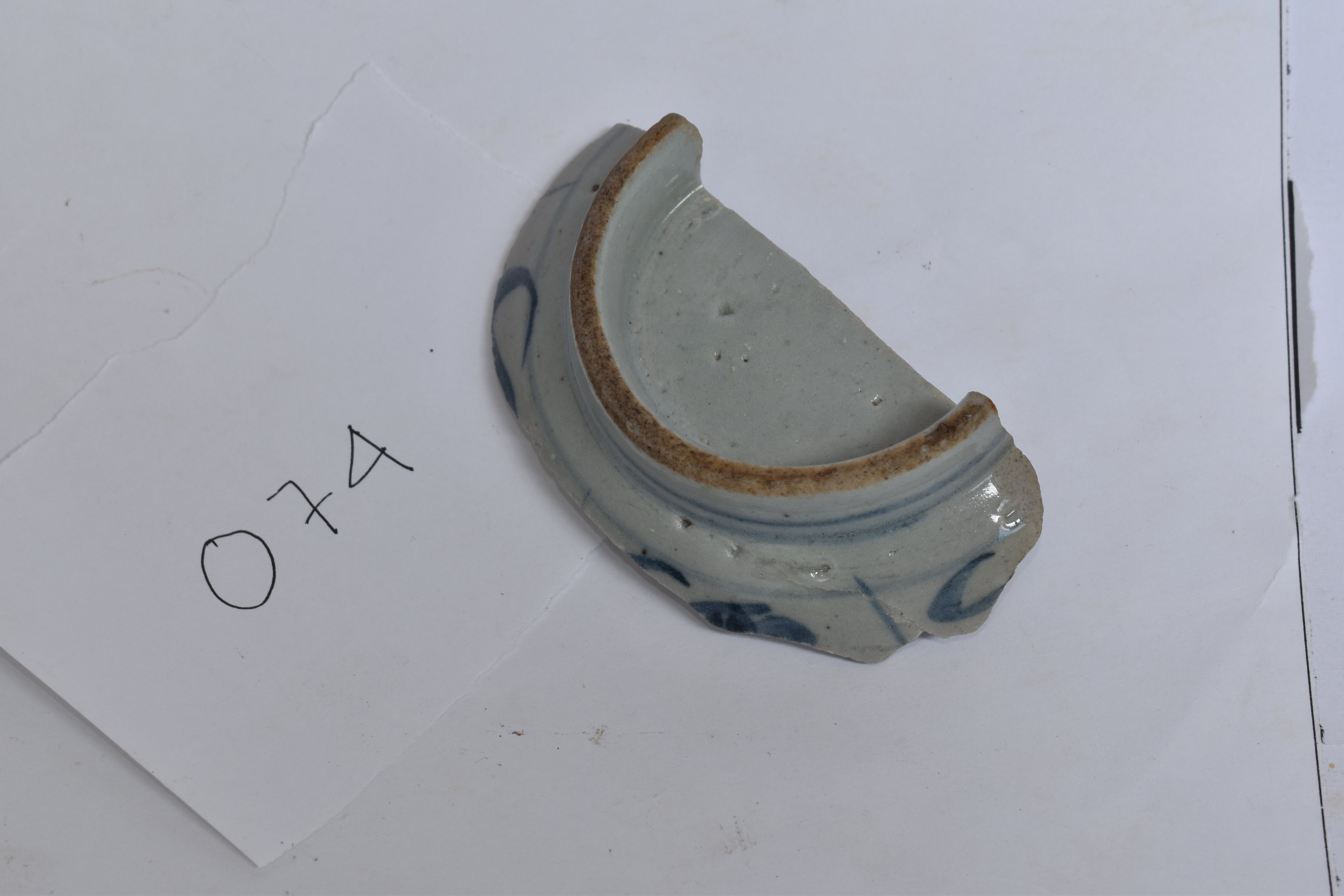 Fragmen keramik porselen yang diperoleh dari hasil eksakavasi arkeologi di Pulau Onrust, Kabupaten Kepulauan Seribu, Jakarta ini di perkirakan berbentuk wadah berbentuk mangkuk yang dibuat menggunakan teknik roda putar. Fragmen keramik ini memiliki ukuran 6.5 cm, terbuat dari tanah liat putih (kaolin) dan mineral feldspar (petunze) yang dibakar pada suhu sangat tinggi sekitar 1.250°C – 1.350°C. Badan keramik berwarna putih keabuan, dihaiasi motif flora berupa suluran bunga dan lingkaran spiral berwarna biru kehitaman yang dilukis di bawah glasir putih transparan. Walaupun ornamennya berwarna kehitaman, keramik ini tetap tergolong ke dalam porselen biru putih (blue and white porcelain). Berdasarkan karakteristiknya, fragmen keramik ini berasal dari Dinasti Qing abad ke-19 Masehi.