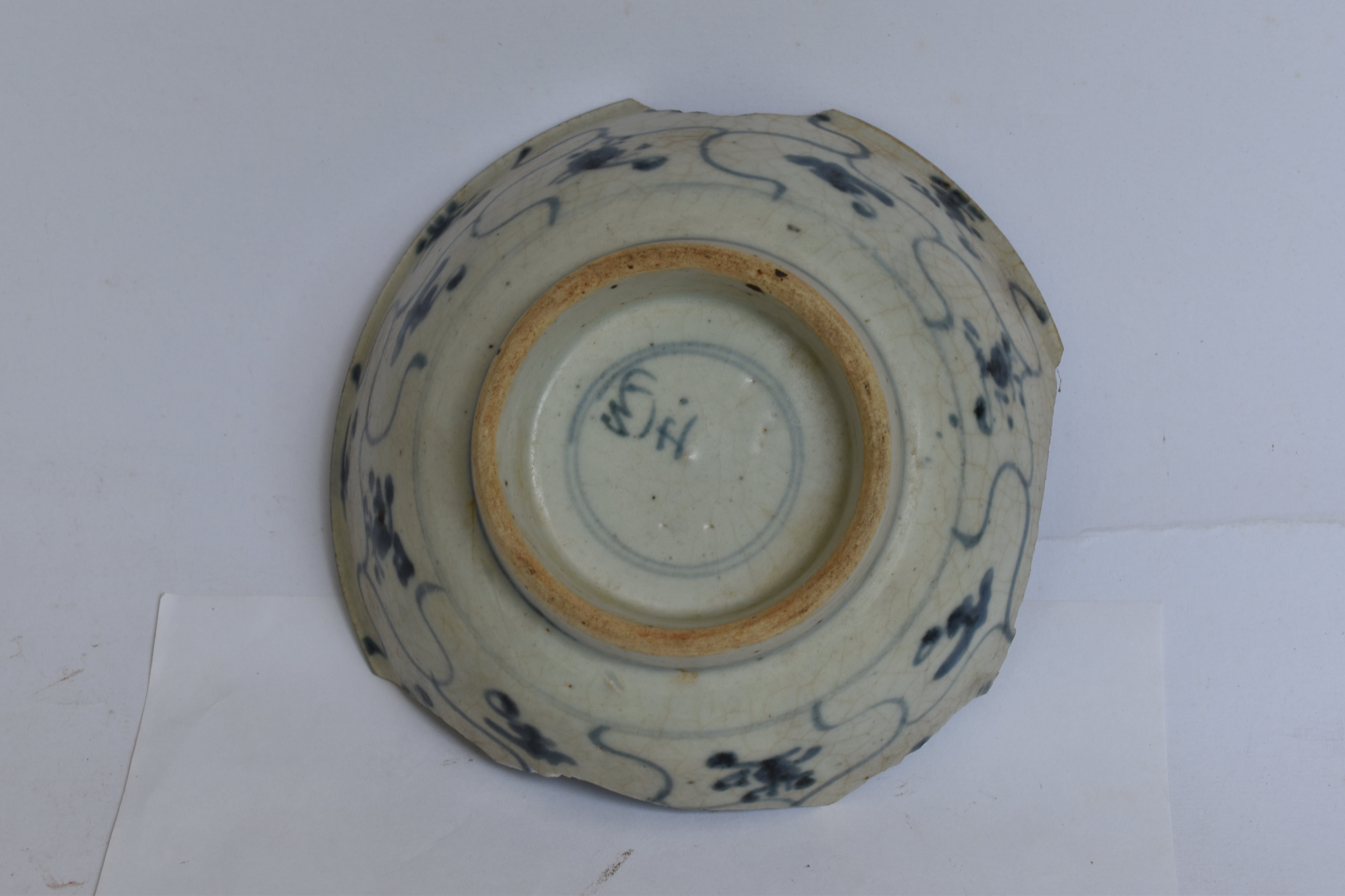 Pecahan keramik porselen biru putih ini memiliki kondisi yang sudah tidak utuh lagi. Ini merupahan pecahan bagian dasar wadah berupa mangkuk yang dibuat menggunakan teknik roda putar. Bahan dasar pembuatannya adalah tanah liat putih (kaolin) dan mineral feldspar (petunze). Kualitas bahan keramik ini sangat bagus, putih dan bersih sehingga warnanya sangat mempesona. Keramik ini dibakar pada suhu sangat tinggi sekitar 1.250°C – 1.350°C. Permukaannya dihiasi motif sulur-suluran dan garis-garis spiral berwarna biru yang dilukis di bawah glasir. Sekilas, keramik ini terlihat sangat bersih dan indah, warna putihnya sempurna serta motif berwarna biru juga sangat seimbang. Ini menandakan bahwa keramik ini dibuat di dapur Dehua – Fujian, salah satu daerah di China yang memiliki tanah liat paling bersih di antara wilayah-wilayah penghasil keramik kuno lainnya di China. Selain itu, karakter keramik ini menunjukkan bahwa mangkuk ini dibuat di pada abad ke-19 Masehi ketika China berada di bawah Dinasti Qing.
