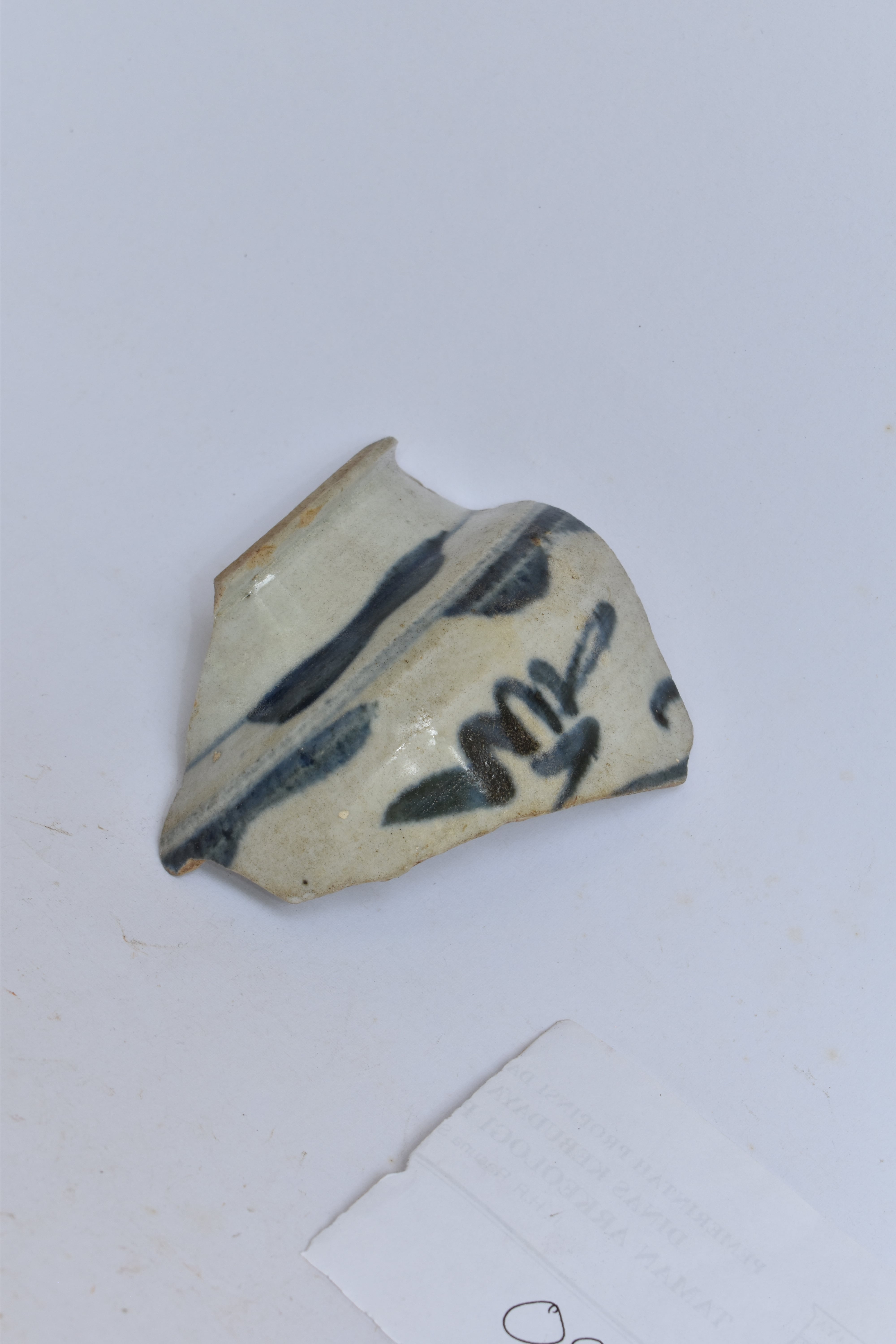 Fragmen keramik porselen biru putih China yang diperoleh dari hasil ekskavasi arkeologi di Pulau Onrust, Kabupaten Kepulauan Seribu, Jakarta ini berbentuk wadah yang dibuat menggunakan teknik roda putar. Fragmen keramik ini terbuat dari tanah liat putih (kaolin) dan mineral feldspar (petunze) yang dibakar pada suhu sangat tinggi sekitar 1.250°C – 1.350°C. Permukaan luar dihiasi motif flora warna biru pudar yang dilukis di bawah glasir putih transparan. Selain itu, terdapat bekas pembakaran berupa garis melingkar berwarna cokelat kemerahan. Keramik ini termasuk dalam kategori porselen biru putih (blue and white porcelain). Berdasarkan karakteristiknya, keramik ini dibuat di China pada masa Dinasti Qing abad ke-19 Masehi.