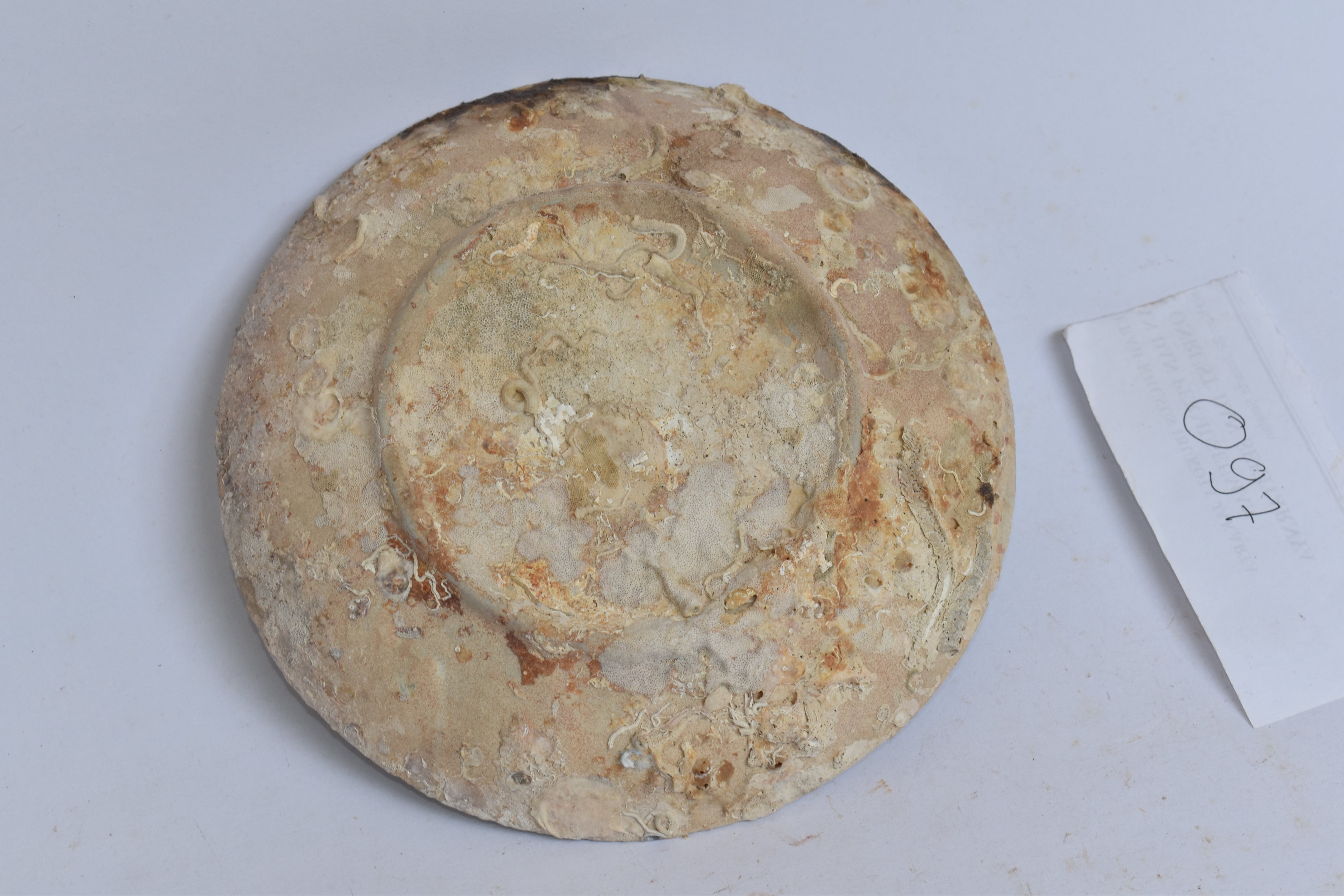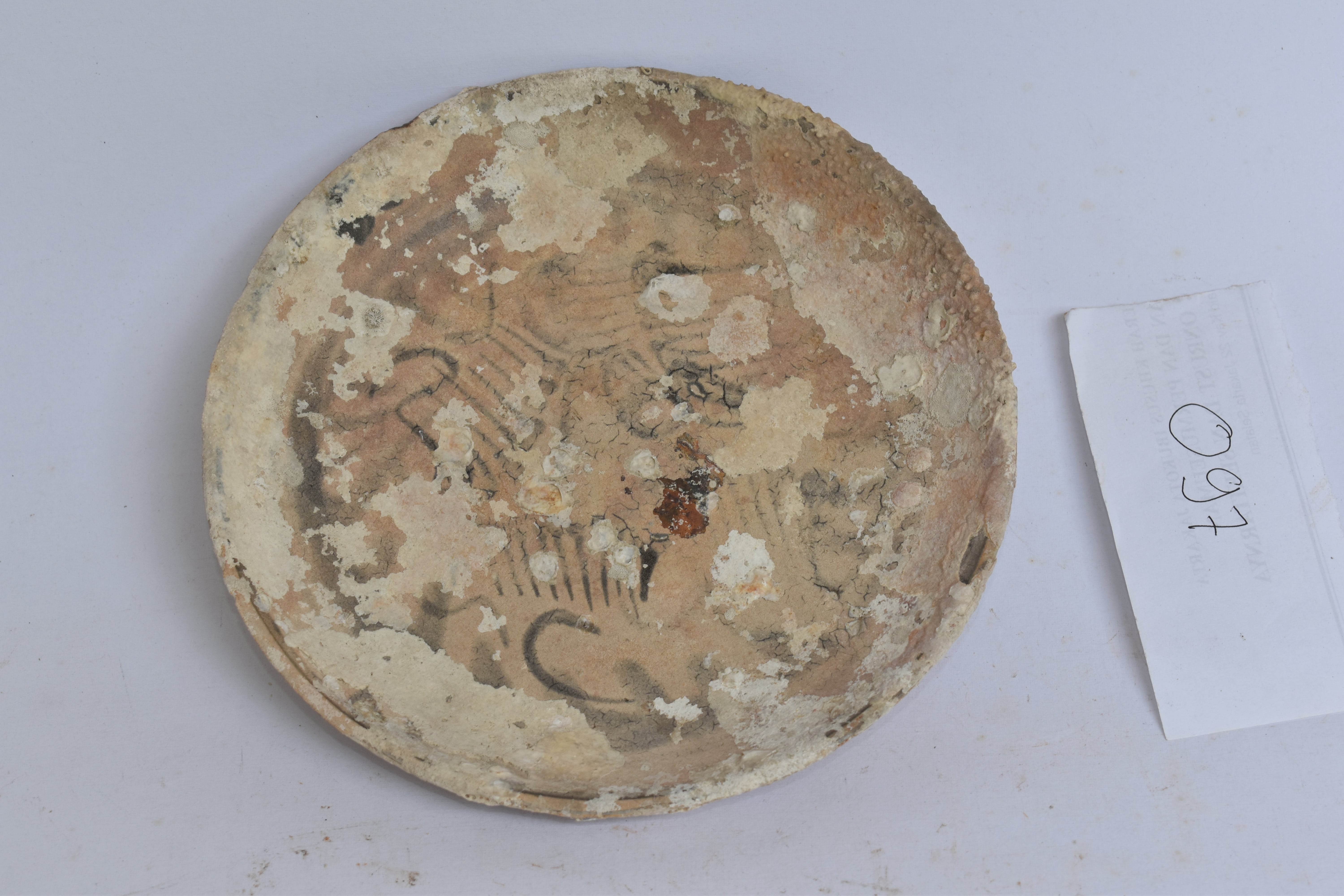 keramik ini memiliki motif suluran-suluran berwarna biru yang dibuat menggunakan teknik lukis di bawah glasir. Namun hiasan ini tidak lagi jelas terlihat karena tertutupi oleh biota laut yang melekat pada badan keramik serta warna permukaan luarnya yang telah menguning. Bentuknya adalah piring yang dibuat dari tanah liat putih (kaolin) dan mineral feldspar (petunze) yang dibentuk melalui teknik roda putar. Berdasarkan jenisnya, keramik ini tergolong dalam kategori keramik porselen biru putih (blue and white porcelain) yang dibuat pada masa dinasti Qing – China abad ke-19 Masehi. Keramik porselen adalah salah satu jenis keramik yang dihasilkan di China sejak abad ke-6 Masehi. Karakter motif dan bahan pada fragmen ini jelas menampilkan bahwa mangkuk ini dihasilkan pada abad ke-19 Masehi. Pada masa ini, China di bawah Dinasti Qing banyak menghasilkan keramik biru putih dengan motif dan bentuk yang bervariasi untuk dieksport ke berbagai negara seperti Indonesia, Malaysia, Thailand, Singapura serta beberapa negara lainnya di Asia Tenggara.