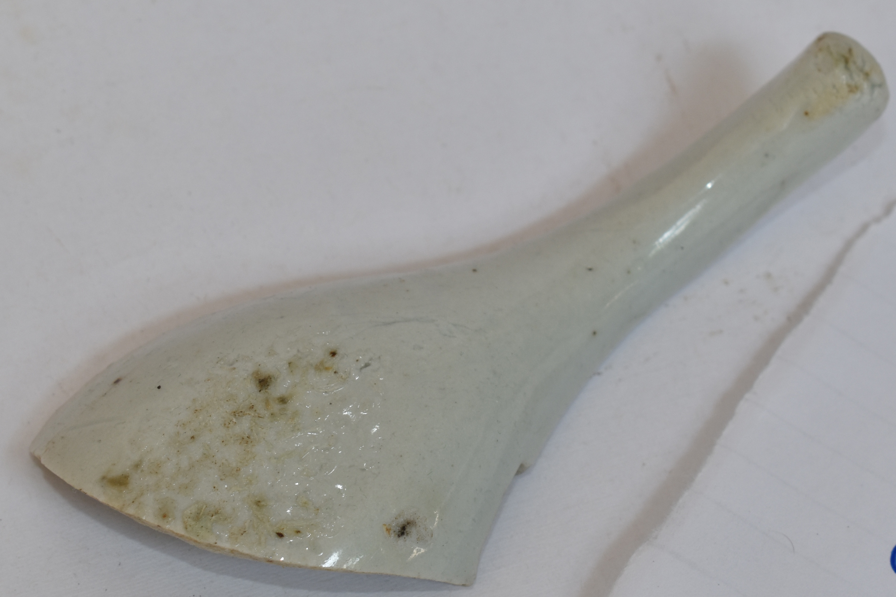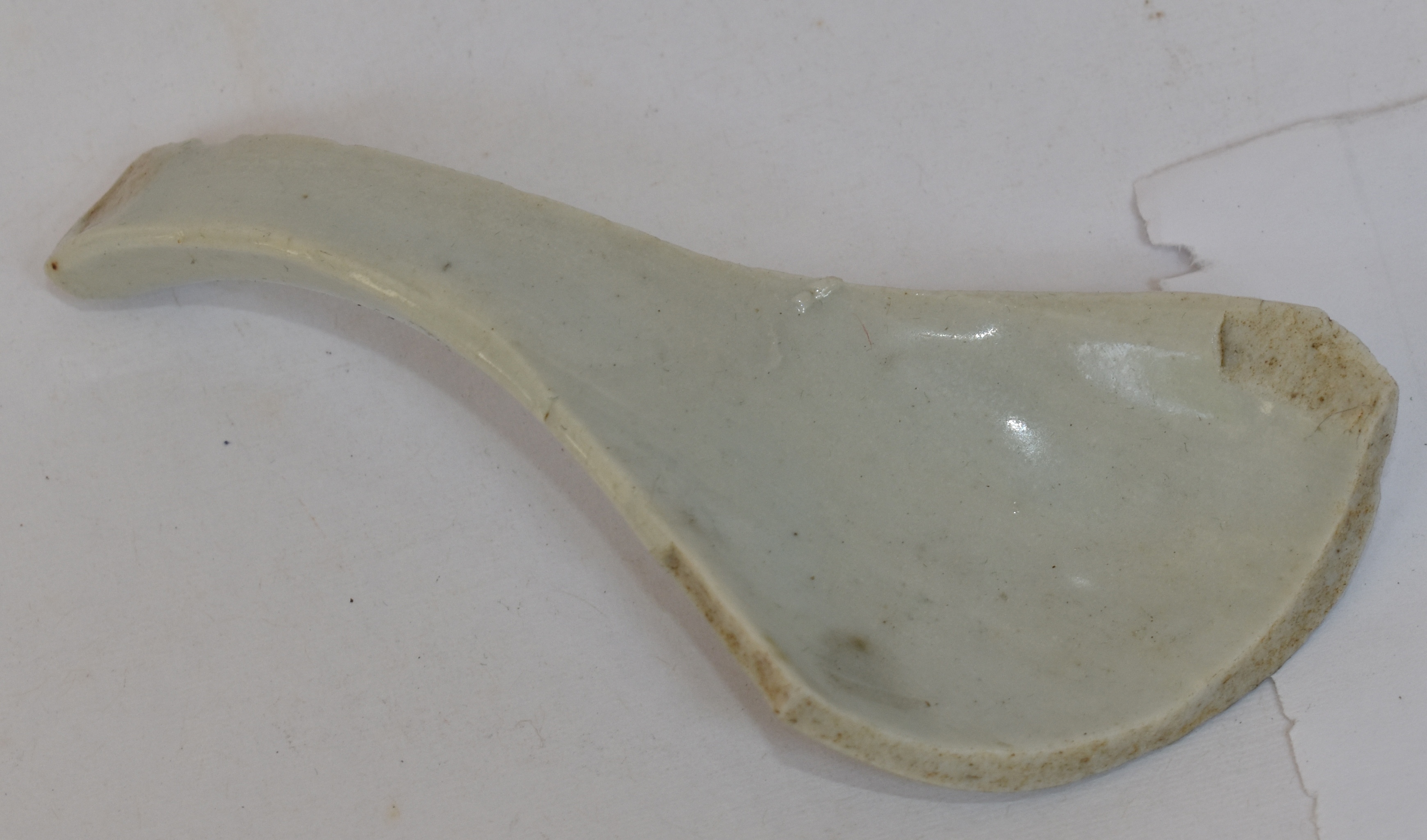 Sendok porselen putih dengan panjang 8 cm ini dibuat dari tanah liat putih (kaolin) dan mineral feldspar (petunze) dan dibakar pada suhu sangat tinggi sekitar 1.250°C – 1.350°C. Bahannya berwarna putih, polos tanpa ornament dan dilapisi glasir putih transparan pada keseluruhan permukannya. Berdasarkan morfologinya, keramik ini dikategorikan sebagai porselen putih (white porcelain). Berdasarkan karakternya, sendok porselen biru putih ini dibuat di dapur Jingdezhen – Jiangxi, China pada masa Dinasti Qing abad ke-19 Masehi.