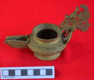 Pecahan bagian dasar porselen biru putih berupa wadah berbentuk mangkuk. Diameter bagian dasar mangkuk ini adalah 12 cm. Material utama pembuatan mangkuk ini adalah tanah liat putih (kaolin) dan mineral feldspar (petunze) yang dibentuk melalui teknik roda putar dan dibakar hingga suhu 1.250°C – 1.350°C. Badan keramik berwarna putih dan dilapisi glasir bening pada keseluruhan permukaannya. Pada sisi dalam terdapat motif sulur-suluran dan garis spiral berwarna biru yang dilukis di bawah glasir. Kualitas bahan keramik ini sangat bagus dan jernih sehingga badannya berwarna putih bersih. Berdasarkan ciri-cirinya, keramik ini berasal dari China, dihasilkan di dapur Dehua – Fujian pada masa Dinasti Qing abad ke-19 Masehi.