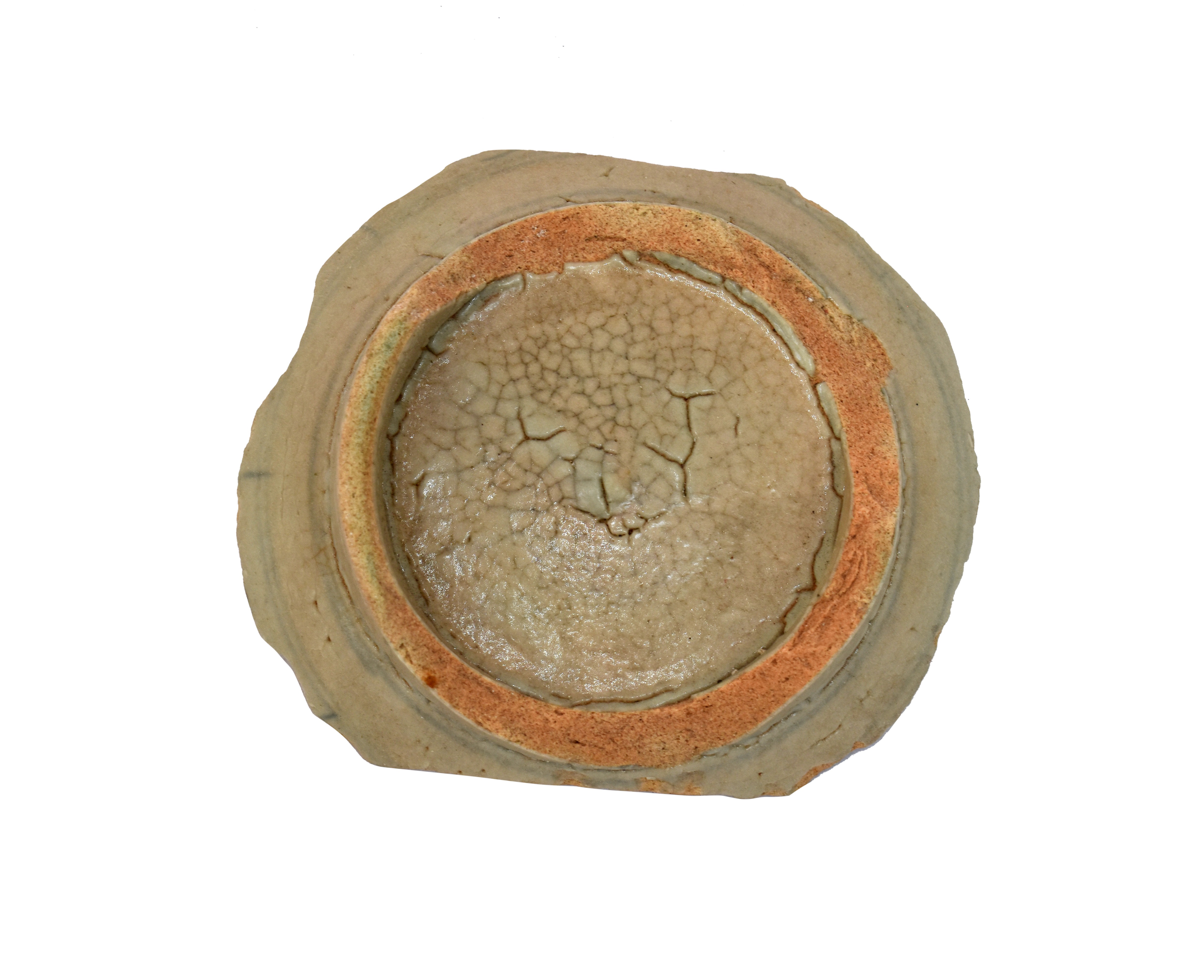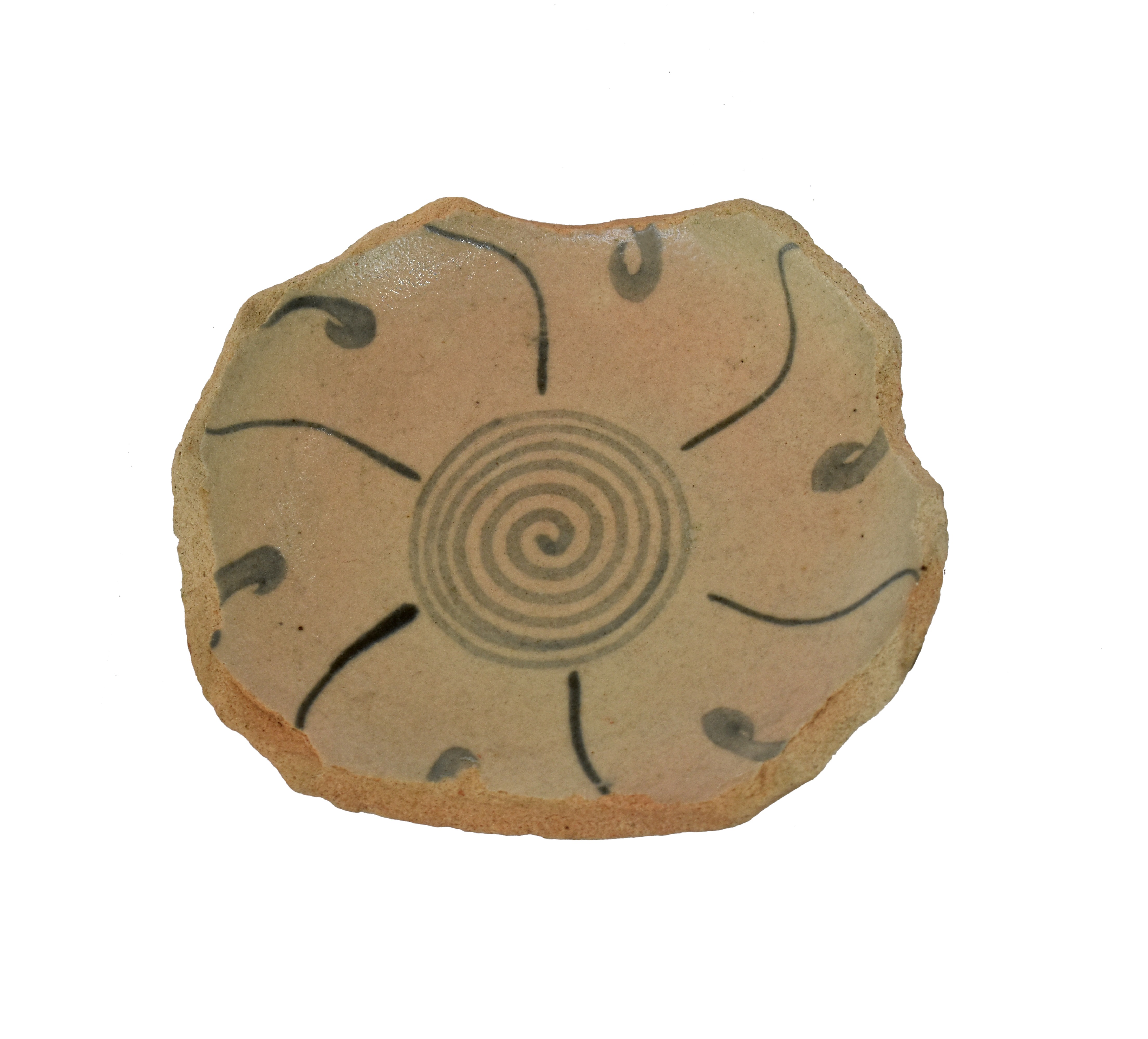 Pecahan bagian dasar porselen biru putih berupa wadah berbentuk mangkuk. Diameter bagian dasar mangkuk ini adalah 8 cm. Material utama pembuatan mangkuk ini adalah tanah liat putih (kaolin) dan mineral feldspar (petunze) yang dibentuk melalui teknik roda putar dan dibakar hingga suhu 1.250°C – 1.350°C. Badan keramik berwarna putih kekuningan dan dilapisi glasir bening pada keseluruhan permukaannya. Pada sisi dalam terdapat motif sulur-suluran dan garis spiral berwarna biru yang dilukis di bawah glasir. Kualitas bahan keramik ini sangat bagus dan jernih sehingga badannya berwarna putih bersih. Berdasarkan ciri-cirinya, keramik ini berasal dari China, dihasilkan di China pada masa Dinasti Qing abad ke-19 Masehi