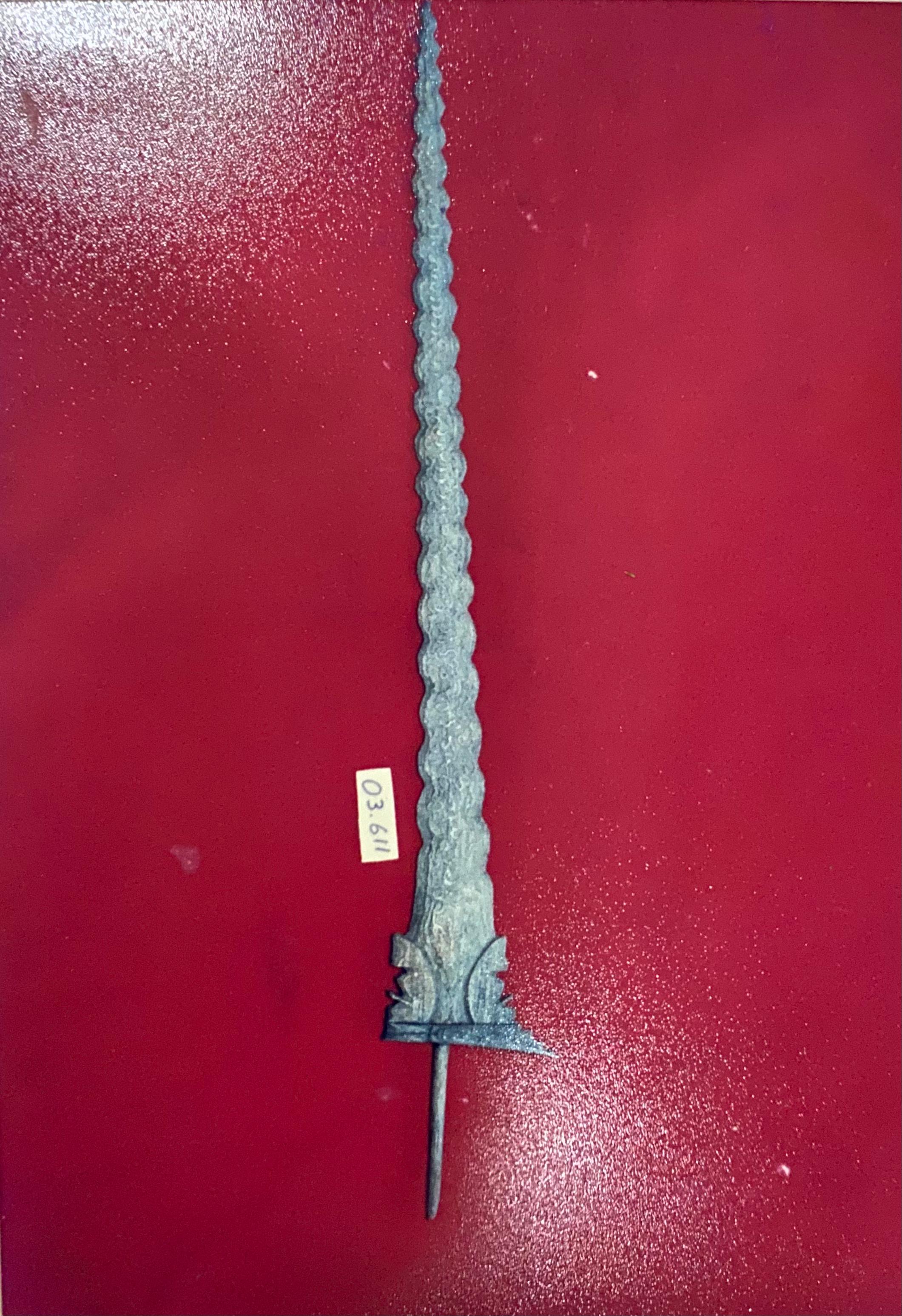 Keris ini berluk 45, terbuat dari bahan besi dan nikel, keris ini tanpa tangkai dan kerangka, pada pangkal terdapat motif hias 2 manusia duduk, fungsi belum diketahui.