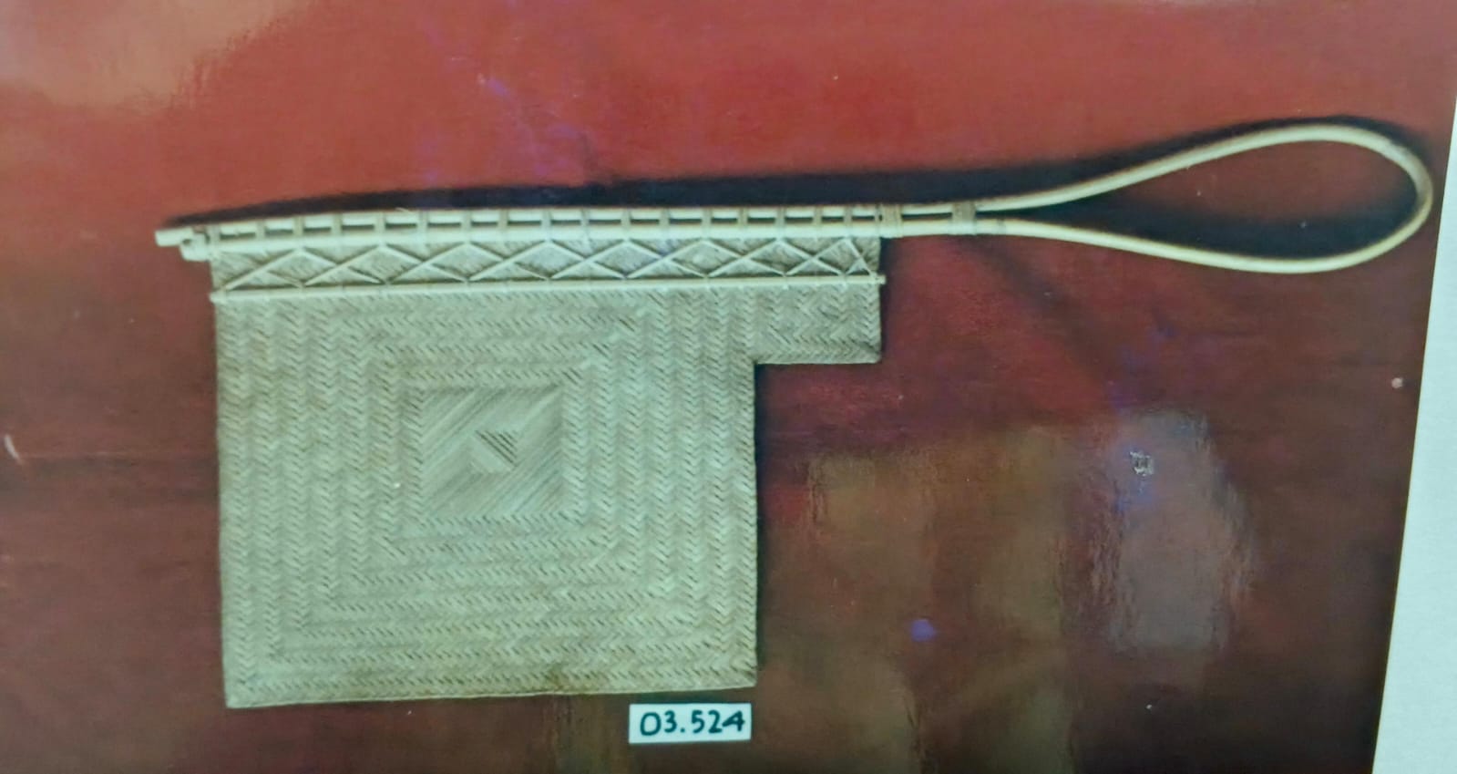 Benda ini terbuat dari bahan dasar bambu, rotan. berbentuk segi empat bertangkai, berwarna coklat.