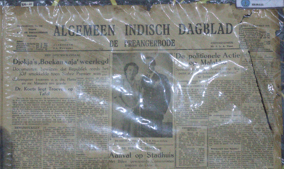 Koleksi ini berupa koran yang bernama "Algemeen Indisch Dagblad", dirilis hari rabu tanggal 26 November 1947. Harga langganan koran ini untuk daerah Bandung dan Cimahi, yaitu f 15. Penerbitnya adalah N. V. De Priangerbode di Bandung. 488 Volume No. 267. Alamatnya, yaitu Directie & Redactie (No. telp: 169), Administratie (No. telp: 62), Bragaweg 11/18 (Postbox: 62). Direkturnya bernama J. A. Wormser dan Ketua Redaksinya bernama Mr. J. L. A. Visser. Pada halaman pertama, terdapat beberapa berita, diantaranya yaitu berita yang berjudul "Lt. Gen. Spoor Over: Aflossing en Demobilisatie" (Penebusan dan Mobilisasi), "De Conferentie te Londen" (Konferensi London), "Onze Moeilijkheden en Mogelijkheden" (Kesulitan dan Peluang Kita), "Ecafe in Manilla Geopend" (Ecafe Dibuka di Manilla), "Frankrijks Ontreddering" (Kehancuran Prancis). Selain itu, terdapat gambar sosok perdana menteri Kanada dengan keluarganya di Istana Soestdijkast pada tanggal 15 November dan potret Lt. Gen. S. H. Spoor. Pada halaman selanjutnya, terdapat beberapa berita, diantaranya berita "Rotterdamse Voetbalzege Nederlands Bondselftal met Zes-Nul verpletterd" (Kemenangan Sepak Bola Rotterdam Timnas Belanda Dihancurkan dengan 6-0), "Perzië antwoordt Rusland Weerlegging Russische Beschuldigingen inzake verworpen Olie-Overeenkomst" (Persia Menjawab Rusia Sanggahan atas Tuduhan Rusia Pada Penjanjian Minyak yang Ditolak), "Van het Front in China Vastberaden Communistische Poging Om Hankou te veroveren" (Dari Front Tiongkok Upaya Komunis untuk Bertekad Menaklukan Hankou), terdapat juga berita berjudul "Stad Protestantse Gemeente Bandoeng" (Kota Masyarakat Protestan Bandung). Kemudian, di bagian kiri bawah terdapat gambar beberapa orang yang sedang bermain bola. Halaman selanjutnya, terdapat berita berjudul "Een Land Kan Siet Allen Zijn Amerika en de Wereld door Generaal Dwight Eisenhower" (Satu Negara tidak dapat Sendiri Amerika dan Dunia) oleh Jenderal Dwight Eisenhower, "Anti-Communistisch parool in Zuid-Amerika" (Semboyan Anti Komunis di Amerika Selatan), "Derde Oorlog wordt Atoomoorlog" (Perang Ketiga menjadi Perang Atom), "Toetssteen Duitsland" (Batu Ujian Jerman), "Communisme in Italiê Allen de economisch Ontwrichten volgen het Rode Spoor" (Komunisme di Itali hanya mereka yang Terganggu secara Ekonomi yang Mengikuti Jalur Merah), selain itu terdapat karya tulis berjudul "Langs de Convooiweg" (Sepanjang Konvoi" yang ditulis oleh E. F. Kael. Terdapat beberapa gambar, yang pertama gambar kota dan pantai yang nampak seperti di Brazil, kemudian gambar bangunan pabrik yang sedang dibongkar, gambar bangun hancur di Hiroshima, dan potret Jenderal Dwight Eisenhower. Halaman terakhir berisi iklan dan pengumuman, beberapanya yaitu iklan acara pertunjukan, jadwal film, pengumuman tunangan, perjanjian, iklan toko, iklan kecap, toko kacamata, toko sepatu, iklan jepit rambut, perhiasan, dan iklan celana dalam. Kondisi koleksi utuh, namun terdapat beberapa kerusakan. Diantaranya, yaitu warna koran sudah menguning, di bagian tepi setiap sisi koran tampak lapuk, di beberapa titik terdapat noda yang menghitam, terdapat sobekan di beberapa titik, dan bekas lipatan.