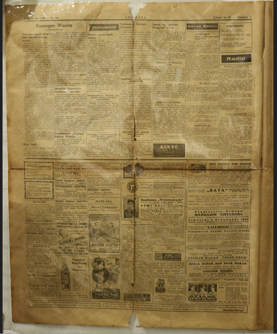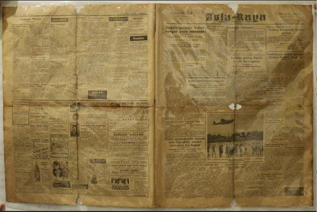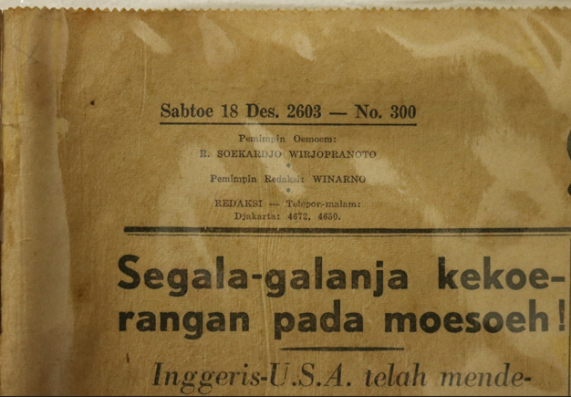 Surat kabar berbentuk persegi panjang terbitan Asia Raya yang berslogan “Poesat persoerat-kabaran di Djawa”. Surat kabar terbit pada Sabtoe 18 Des. 2603 - No. 300, tahoen ke II di Djakarta yang terdiri dari 4 halaman. Pemimpin redaksi bernama Winarno. Berita utama dari surat kabar berjudul “Segala-galanja kekoerangan pada moesoeh !". Pinggiran bagian sisi atas dan bawah surat kabar bergerigi. Kertas surat kabar berwarna putih dan telah menguning. Ditemukan beberapa noda coklat di permukaan surat kabar. Terdapat lubang di setiap tengah lembar surat kabar, dan sobekan di pinggir sisi surat kabar. Setiap lembar terdapat lipatan dan sobekan yang membagi surat kabar menjadi 4 bagian.