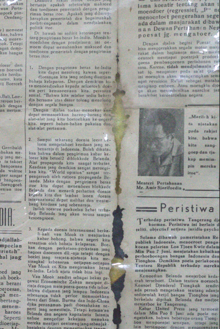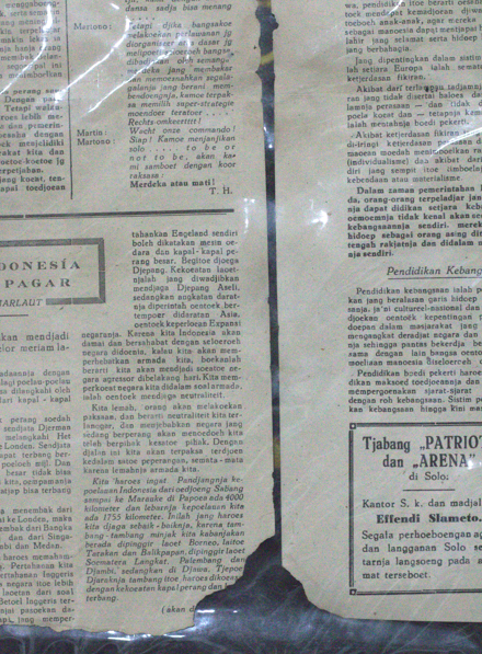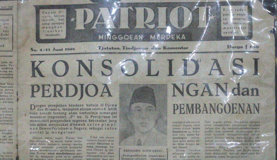Halaman 1: Koran ini terdiri dari enam halaman. Pada halaman pertama memuat judul koran "Patriot Mingguan Merdeka" di bagian atas tengah. Di kanannya terdapat tulisan "Kita sadar punya: negara, pemerintah, tentara, masyarakat sendiri" dan disebelah kirinya terdapat tulisan "Kepala dingin, pikiran jernih, hati tetap untuk menghacurkan musuh." Pada koran ini terdapat nomor edisi 4-13 Juni 1946 dan terdapat juga harga harga berlangganan sebesar 1,50 Gulden. Pada halaman ini terdapat artikel utama dengan judul "Konsolidasi Perjuangan dan Pembangunan" dan artikel lain yang berjudul "Peristiwa Tangerang" serta terdapat gambar beberapa tokoh yaitu: Presiden Soekarno, Mr. Amir Syarifuddin, P. M. Syahrir, dan Sudirman. Pada bagian kanan bawah terdapat informasi mengenai pimpinan redaksi koran ini beserta staf, pembantu tetap, dan bagian tata usahanya. Halaman 2 : Pada bagian kanan atas terdapat tulisan tanggal yaitu "Kamis, 13 Juni 1946", tulisan "Patriot" pada bagian tengah, serta tulisan "Halaman 2" pada bagian atas kiri. Pada halaman ini memuat artikel berjudul "Memperbesar semangat mencipta dan membangun" yang disertai dengan gambar Pelabuhan Terapung. Halaman 3 : Pada bagian kiri atas terdapat tulisan tanggal yang sama dengan halaman sebelumnya, bagian tengah atas terdapat tulisan "Patriot" dan pada bagian kanannya terdapat tulisan "Halaman 3". Halaman ini memuat artikel berjudul "Merebut Hegemoni Dunia", disertai dengan gambar tiga tokoh yaitu: P. M. Clement Attlee, Presiden Truman, dan Generalissimo Stalin. Pada bagian kanan bawah terdapat informasi singkat dari redaksi tentang gambaran isi koran selanjutnya. Halaman 4 : Pada bagian kanan atas terdapat tulisan tanggal yang sama dengan halaman sebelumnya, bagian tengah atas terdapat tulisan "Patriot" dan pada bagian kirinya terdapat tulisan "Halaman 4". Pada halaman ini memuat beberapa artikel dengan judul: "Menyambut Panitia Penyelidik Pengajaran", "Catatan seminggu", dan "Sekitar Pengiriman Beras ke India". Pada bagian kiri bawah terdapat informasi lokasi kantor cabang koran Patriot dan Arena di Solo. Halaman 5 : Pada bagian kanan atas terdapat tulisan tanggal yang sama dengan halaman sebelumnya, bagian tengah atas terdapat tulisan "Patriot" dan pada bagian kirinya terdapat tulisan "Halaman 5". Pada halaman ini terdapat dua artikel dengan judul "Tak mungkin ada perang saudara besar-besaran" dan "Kapal-kapal Indonesia sebagai Pagar". Halaman 6 : Pada bagian kanan atas terdapat tulisan tanggal yang sama dengan halaman sebelumnya, bagian tengah atas terdapat tulisan "Patriot" dan pada bagian kirinya terdapat tulisan "Halaman 6". Halaman ini memuat artikel dengan judul "Rakyat Serentak Menghadapi Bahaya Nasional" disertai gambar tokoh VYSHINSKI dan Cerita bersambung dengan judul "Kisah Lukisan". Kodisi koleksi: Koleksi koran ini utuh dengan catatan kerusakan berupa robek pada beberapa sudut dan sisi sehingga menyebabkan beberapa tulisan ikut hilang, terdapat juga robek pada bagian bekas lipatan koran, dan ditemukan noda kuning pada beberapa bagian koran, serta terdapat lubang-lubang kecil pada beberapa bagian koran yang diduga akibat serangga.