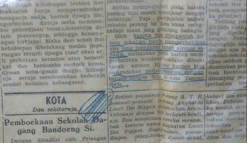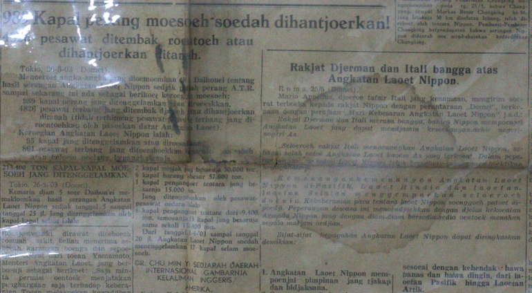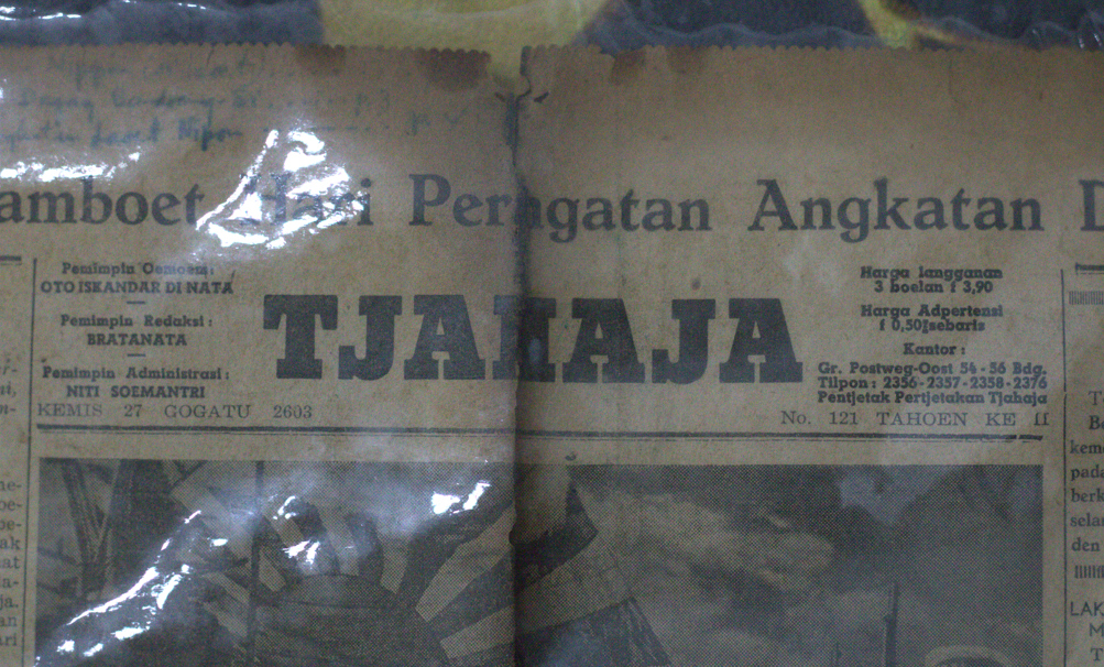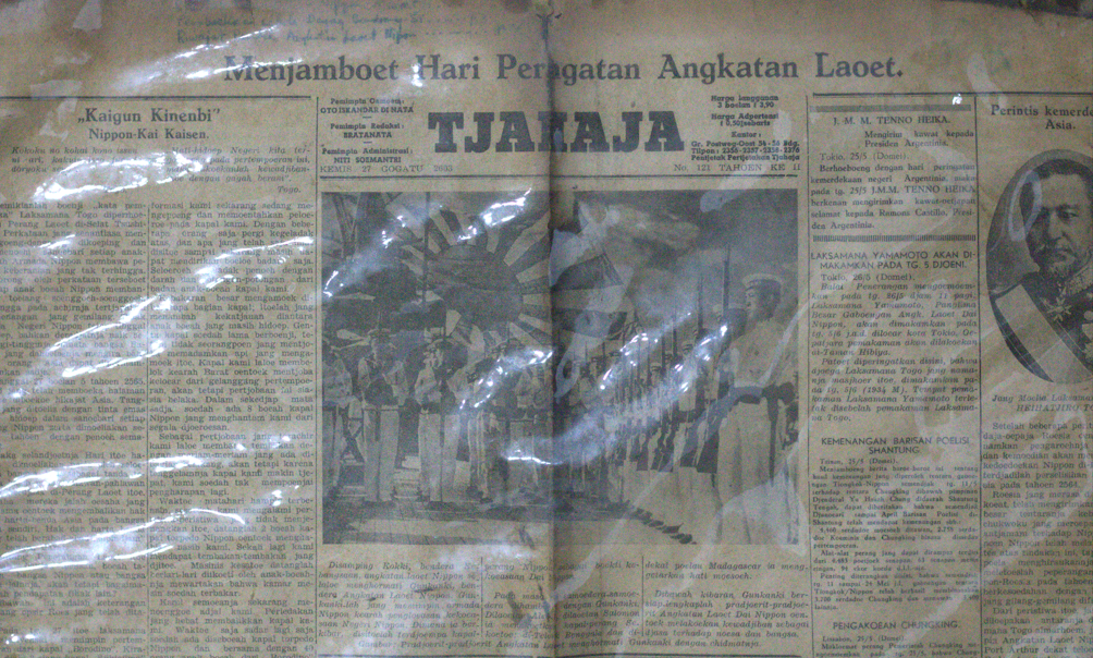 (Halaman 1) Koran ini memiliki nama "Tjahaja" dengan pemimpin umum Otto Iskandar Dinata, pemimpin redaksi Bratanata dan pemimpin administrasi Niti Sumantri. Harga langganan tiga bulan koran ini sejumlah f 3,90. Harga apertensi yaitu f 0,50 sebaris. Kantornya terletak di Gr. Postweg-Oost 54-56 Bdg. Koran ini diterbitkan hari kamis 27 Gogatu 2603. Koran ini merupakan koran edisi "Menyambut Hari Peringatan Angkatan Laut". Informasi koran ini berisikan beberapa artikel berita diantaranya yaitu: artikel "Kaigun Kinenbi, Nippon-kai Kaisen", artikel "989 Kapal Perang Musuh Sudah Di Hancurkan!", artikel "Rakyat Jerman dan Itali bangga atas angkatan laut Nippon", artikel "Tanda terima kasih menyambut hari peringatan angkatan laut", artikel "Perintis kemerdekaan Asia" dengan potret laksamana Markis Heihajtiro Togo. Di lembar kanan ini terdapat gambar angkatan laut Jepang sedang berbaris di atas kapal perang dengan bendera perang angkatan laut Jepang di belakangnya, gambar lainnya yaitu tembakan kapal perang Nippon kepada kapal perang musuh. Pada halaman (2) ini tercetak dengan tinta tebal, seruan untuk "berterima kasih banjaklah terhadap djasa Angkatan Laoet Dai Nippon dengan mengibarkan bendera Kokki dimasing-masing roemah!". Terdapat artikel mengenai penyambutan hari Kaigun Kinenbi (Angkatan Laut). Selain itu termuat juga rangkuman berita dari daerah-daerah di Indonesia seperti Jakarta, Bogor, Cianjur, Sumedang, Garut, dan beberapa daerah lain di Pulau Jawa. Dalam halaman ini juga dapat kita temukan bagian dari pidato Pemimpin Besar "Poetera" dengan judul "Menggelorakan Lahir-Batin: Dengan toeboeh sehat-koeat". Termuat pula beberapa gambar di halaman ini dengan deskripsi di bawahnya. Gambar pada pojok kanan atas menggambarkan pasukan Angkatan Laut Jepang yang berjalan di hamparan salju di Kepulauan Aleoet. Selain itu, terdapat juga kumpulan gambar yang memperlihatkan tentara sedang berlatih di sebuah lapangan. Pada halaman selanjutnya (3) di bagian atas terdapat kata-kata mutiara yaitu "Teguhkanlah terus-menerus niat meruntuhkan musuh!". Kemudian menampilkan beberapa artikel diantaranya berjudul "Sungai kebangsaan", "Jasa Angkatan Laut Dai Nippon di peperangan A.T.R", artikel berjudul "Berhenti Sebentar Angkatan Laut", artikel "Pembukaan sekolah dagang bandung Si.", artikel "Karangan bunga dari lautan selatan". Artikel lain juga dituliskan dengan judul "Tempat kantor koperasi dalam negeri", artikel "Mencegah racun pindam", artikel "Film pekabaran jawa No. 3", artikel berjudul "Meningkatkan keinsyafan", artikel "Mata roda Jogja", dan artikel "Pedoman Radio". Terdapat juga berita pemerintah tentang kursus pelajaran yang diadakan untuk kedua kalinya. Selain itu terdapat gambar barisan angkatan laut sedang memberikan penghormatannya di Domei Jakarta, gambar lain yaitu gambar pelakat rasa terima kasih kepada angkatan laut dan darat Dai Nippon. Selain itu, terdapat gambar garuda-garuda (pesawat Dai Nippon) yang sedang mencari musuh di atas samudra". Halaman terakhir (4) di bagian atasnya terdapat kata-kata mutiara berbunyi "Selidiki dan Insyaflah akan kepentingan lautan". Halaman ini terbagi menjadi dua bagian. Bagian pertama terdiri dari artikel-artikel seperti "Riwayat pendek angkatan laut Dai Nippon yang gemerlapan: perubahan-perubahan strategi perang lautan", artikel "Changyang direbut tentara Nippon", artikel "Serangan terhadap Chitagong", dan artikel "Pertempuran udara di Tiongkok Tengah". Kemudian terdapat jadwal radio Bd. I (99M) dan Bd. II (124M) untuk hari Jumat 28 Gogatu 2603. Di bagian kedua halaman ini terdapat kolom iklan, antara lain: judul film yang akan ditayangkan, pengumunan pertandingan keroncong, iklan semir sepatu, iklan minyak wangi, minuman, arloji, rumah makan, iklan jual bunga, rumah lelang, tukang servis radio, toko kacamata, toko rokok, toko emas, ahli penyakit, iklan obat, administrasi, iklan krim kulit, kantor notaris, dan berita kematian. Terdapat juga gambar dengan keterangan formasi armada Dai Nippon yang menyerupai benteng di samudra. Kondisi: Kertas mulai menguning, terdapat robek di bagian tengah bawah, terdapat bercak kehitaman di bagian pinggiran koran, di bagian tengah koran terdapat noda bekas air, terdapat juga marginalia dengan tinta berwarna biru di bagian atas, dan terdapat coretan di beberapa titik.