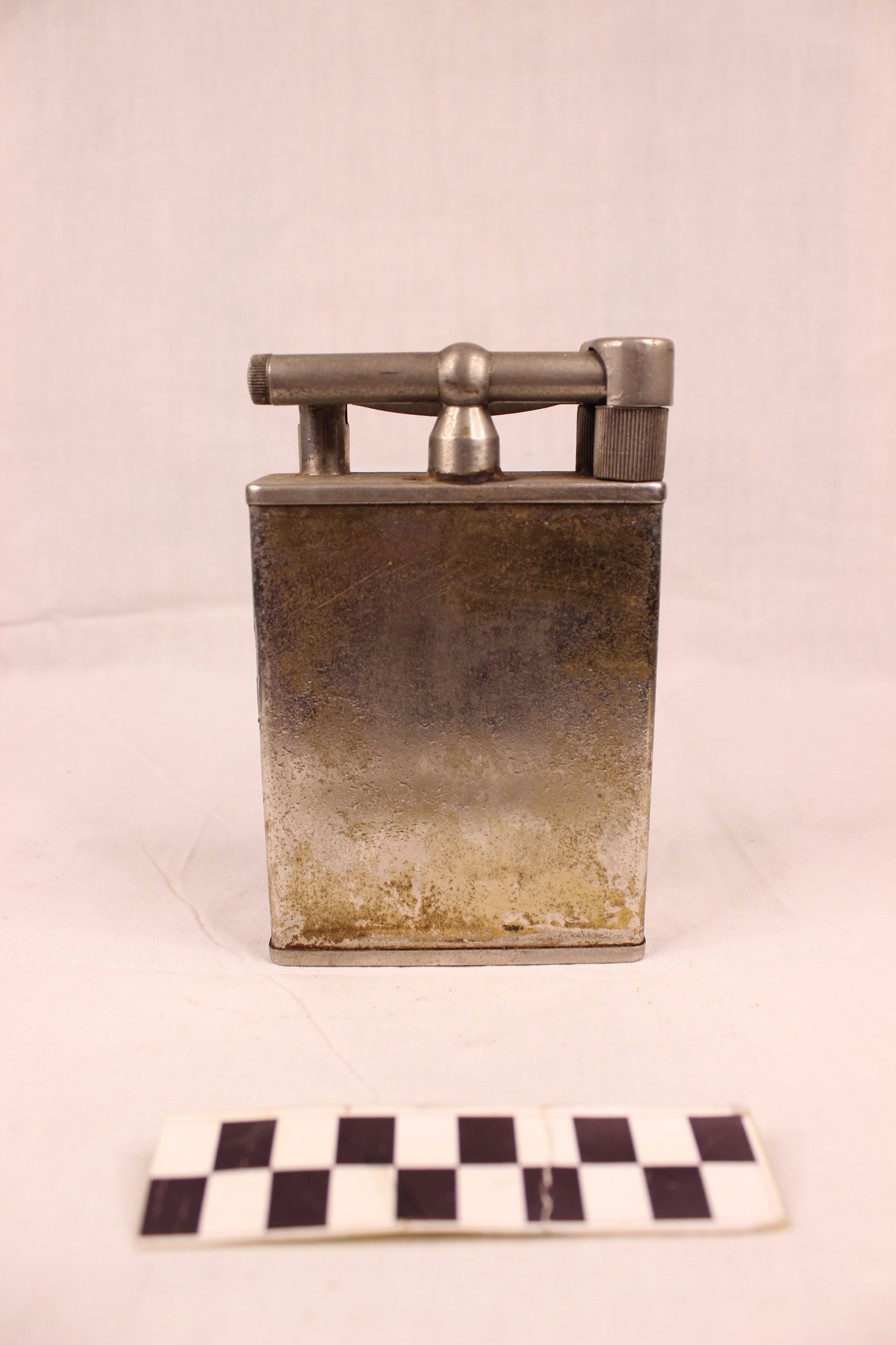 Korek api yang berbentuk persegi Panjang dengan ukiran bermotif floral pada bagian penutup sumbu korek api. Terdapat roda kecil bergerigi pada bagian atas yang berfungsi sebagai pemantik api. Kondisi masih bagus namun warnanya cuku pudar