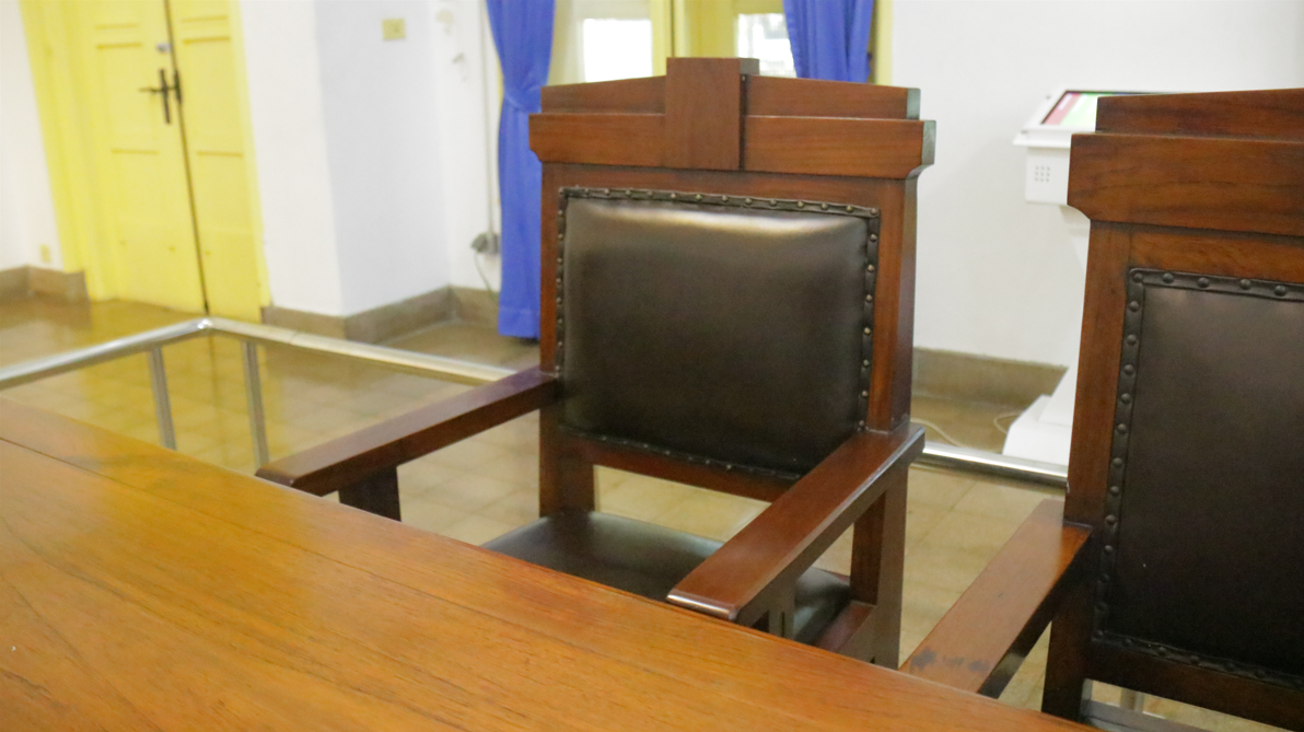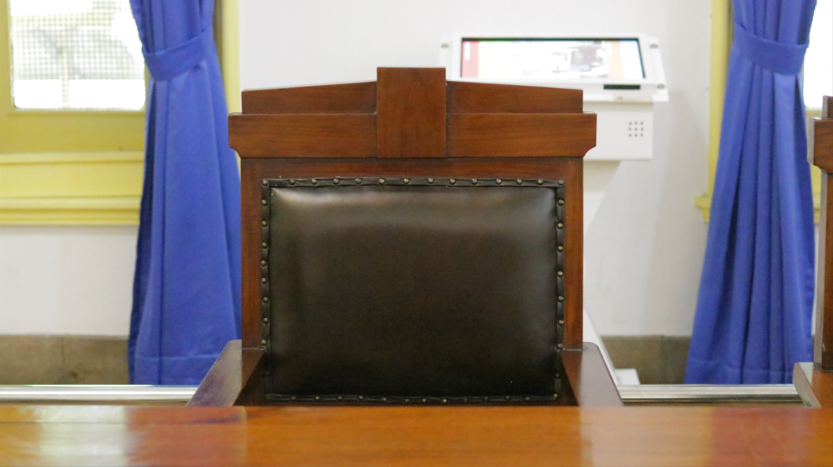 Kursi pengesahan ini berwarna cokelat tua. Terdapat busa pada bantalan duduk dan bagian punggung kursi. Pada sisi-sisinya direkatkan menggunakan paku. Terdapat juga pada sisi kaki dan tangan kursi motif garis memanjang. Kursi dengan nomor inventaris 02.2.17 menghadap ke arah selatan. Kondisi kursi ini masih cukup baik, hanya terdapat sedikit debu di kursi.