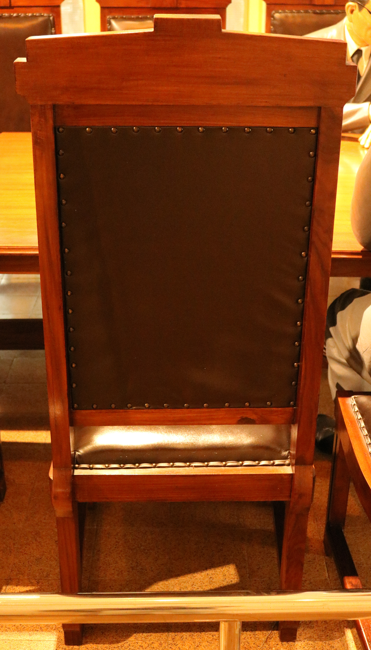 Kursi terletak di ruang perumusan naskah proklamasi dan menghadap timur. Kursi berbahan kayu jati dan berwarna coklat. Kursi memiliki bantalan tempat duduk dan sandaran yang terbuat dari busa, serta dilapisi kulit berwarna coklat tua dan dilengkapi paku sebagai pengikat antara kulit dan kayu. Kursi memiliki 4 kaki dan 3 pijakan kaki. Kursi tidak memiliki 2 sandaran tangan. Kursi memiliki sandaran kepala berbentuk persegi panjang vertikal yang lebih tinggi dibandingkan sisi lainnya. Kayu kursi memiliki noda putih dan goresan di bagian belakang dudukan kursi. Selain itu, terdapat juga noda putih di bantalan dan sandaran kursi.
