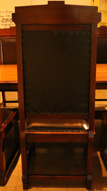 Kursi berbahan kayu jati dan berwarna coklat. Kursi terletak di ruang perumusan menghadap barat. Kursi memiliki bantalan tempat duduk dan sandaran yang terbuat dari busa, serta dilapisi kulit berwarna coklat tua dan dilengkapi paku sebagai pengikat antara kulit dan kayu. Kursi memiliki 4 kaki dan 3 pijakan kaki. Kursi tidak memiliki 2 sandaran tangan. Kursi memiliki sandaran kepala berbentuk persegi panjang vertikal yang lebih tinggi dibandingkan sisi lainnya. Terdapat lubang kecil di bantalan sandaran. Terdapat lubang bekas paku di atas bantalan sandaran kursi.