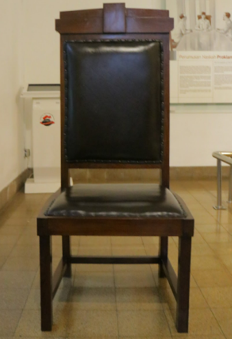 Kursi berbahan kayu jati dan berwarna coklat. Kursi memiliki bantalan tempat duduk dan sandaran yang terbuat dari busa, serta dilapisi kulit berwarna coklat tua dan dilengkapi paku sebagai pengikat antara kulit dan kayu. Kursi memiliki empat kaki dan 3 pijakan kaki. Kursi tidak memiliki 2 sandaran tangan. Kursi memiliki sandaran kepala berbentuk persegi panjang vertikal yang lebih tinggi dibandingkan sisi lainnya.