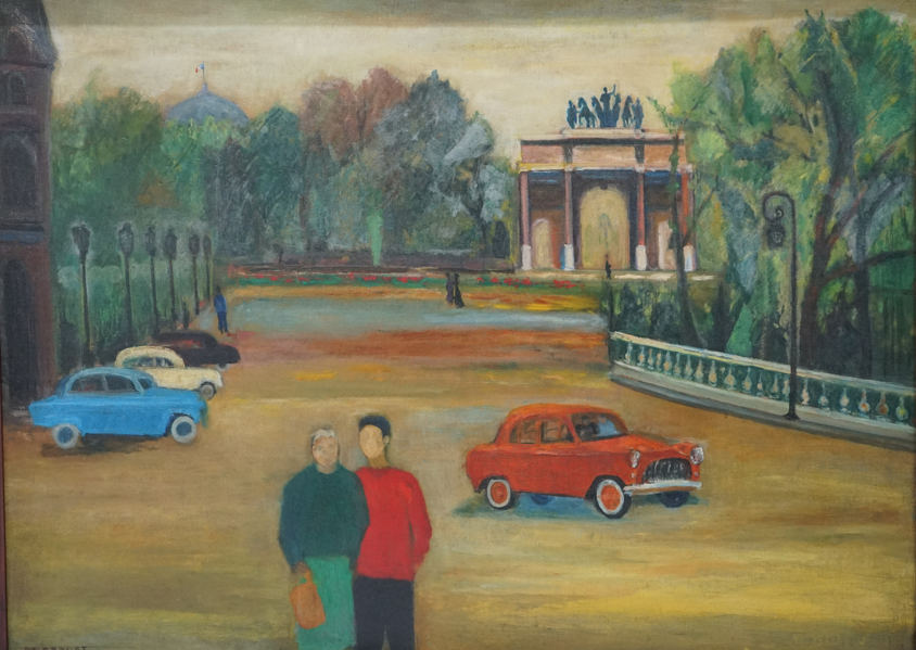 "L’art de Triomphe du Carrousel Granat, Philippe Seni Lukis 623/SL/C 73 x 100 cm Secara umum lukisan ini menggambarkan situasi pelukis yang berada di Arc de Triomphe du Carrousel, Perancis. Pada bagian bawah lukisan terdapat 2 figur yaitu pria yang mengenakan baju lengan panjang berwarna merah dan celana berwarna hitam serta terdapat wanita di samping pria mengenakan baju berwarna hijau dan rok berwarna hijau muda serta memegang tas berwarna jingga. Di belakang 2 figur terdapat 1 mobil berwarna jingga yang sedang berjalan dan 3 mobil berwarna biru, krem dan hitam yang sedang diparkir. Pada bagian sisi kanan terdapat pagar taman yang berwarna krem dan hijau. Terdapat 1 lampu taman berwarna hitam serta terdapat berbagai jenis pohon. Pada bagian sisi kiri terdapat bangunan berlantai 4 dengan warna cokelat. Terdapat taman dengan berbagai jenis pohon disertai 6 lampu taman yang saling berjejer. Pada samping salah satu lampu taman terdapat seorang pria yang mengenakan baju biru dan celana biru tua. Pada bagian tengah terdapat monumen “Arc de Tromphe du Carrousel dengan di depan monumen tersebut terdapat seseorang yang sedang berjualan. Di samping monumen terdapat taman dengan berbagai jenis pohon yang terlihat dua orang yang sedang berjalan di taman. Di belakang taman tampak terdapat sebuah bangunan dengan atap lingkaran pada bagian puncaknya terdapat bendera Perancis. Lukisan ini memiliki gradasi warna krem, cokelat dan hijau pada bagian langit serta memiliki gradasi warna cokelat tua, krem, hijau, kuning dan merah pada bagian jalan. Pada bagian ujung bawah sisi kiri terdapat tulisan “PR. GRANAT 1959” Lukisan ini memiliki frame berwarna cokelat dengan bahan dasar kayu. "