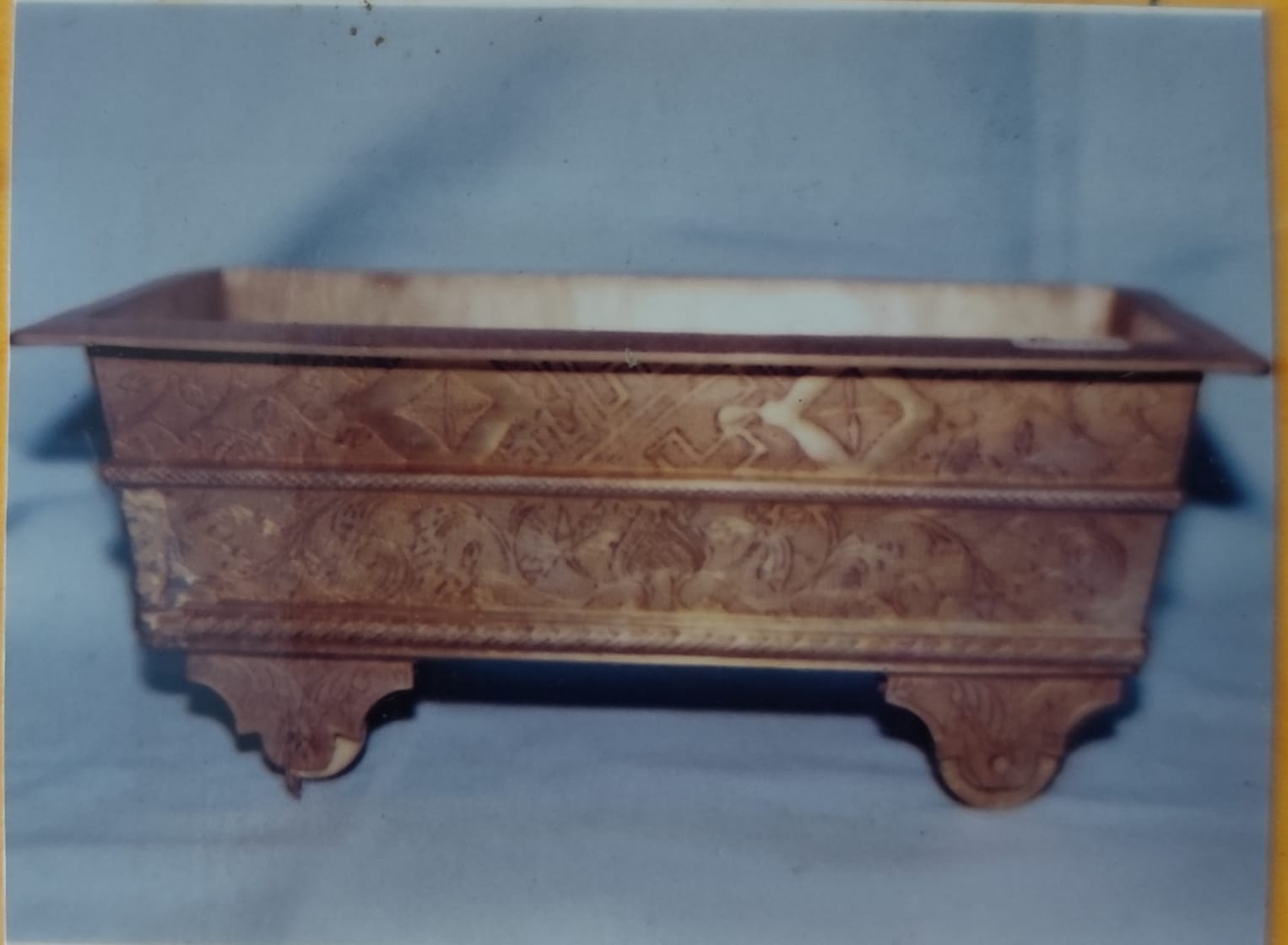 Bahan terbuat dari kuningan dengan warna kuning. Benda ini berbentuk empat persegi panjang dengan ragam hias sulur-suluran dan swastika bagian bawah. Pada masing-masing pojok terdapat empat buah kaki dan roda. Pada bagian atas merupakan wadah anak panginangan tetapi hilang. Benda ini merupakan perlengkapan-perlengkapan peralatan penginangan yang digunakan sebagai wadah anak-anak dan bahan-bahan penginangan.