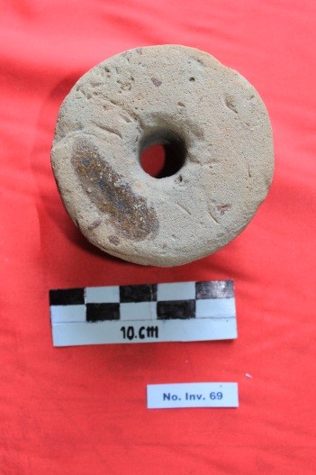 Terbuat dari tanah liat yang dibakar, berbentuk bulat dan terdapat lubang pada bagian tengahnya. Berfungsi sebagai roda putar pada pembuatan gerabah. Keadaan benda cacat.
