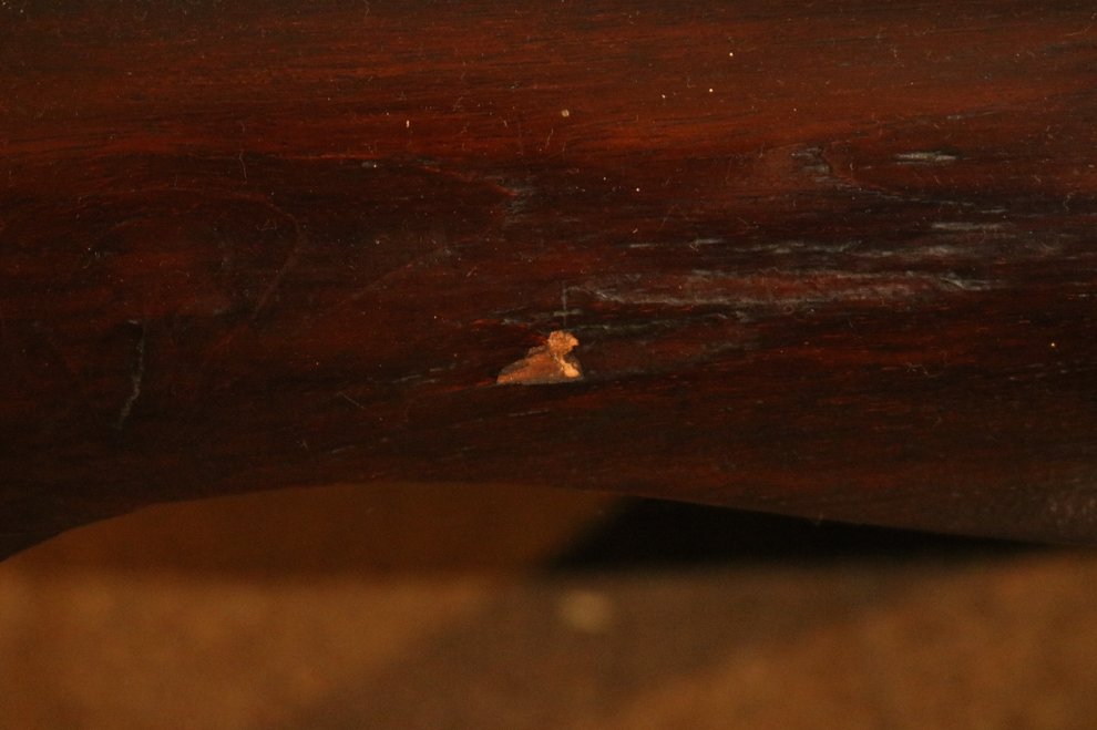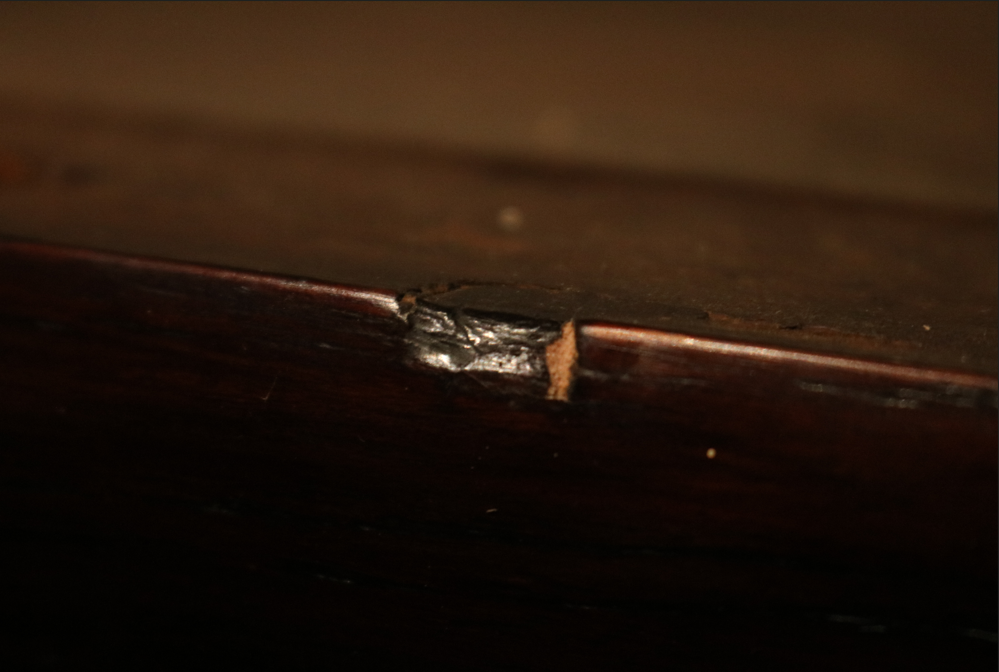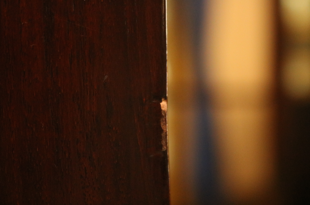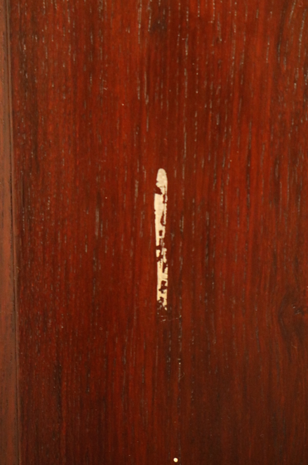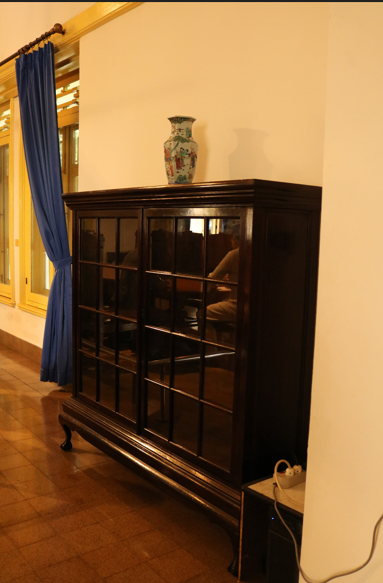 Lemari rak buku ini terbuat dari kayu jati, dengan warna coklat tua. Lemari ini memiliki ukiran yang klasik. Dilihat dari kaki-kaki lemari yang memiliki empat buah, pada bagian bawah kaki terdapat ukiran cakar yang memiliki lima jari. Cakar ini diukir secara detail dengan bentuk yang mirip dengan cakar. Cakar tersebut seperti mencengkram bola yang dimana bola tersebut berfungsi sebagai tumpuan lemari. Ukiran lain pada lemari diukir mengelilingi lemari dengan pola berundak. Adapun pola lainnya pada bagian bawah lemari dekat dengan kaki-kaki berbentuk lengkung. Bagian depan lemari dipasang dengan dua pintu yang disertakan dengan kaca sehingga dapat melihat koleksi buku. Kaca tersebut berbentuk kotak dengan jumlah masing-masing tiap pintu berjumlah dua belas kaca. Bagian dalam rak buku terdiri dari empat tingkat. Pintu dari lemari ini sudah tidak memiliki gagang. Untuk lebar pintu memiliki ukuran 74 cm, panjang pintu 115 cm, tebal sekat 1,315 cm.
