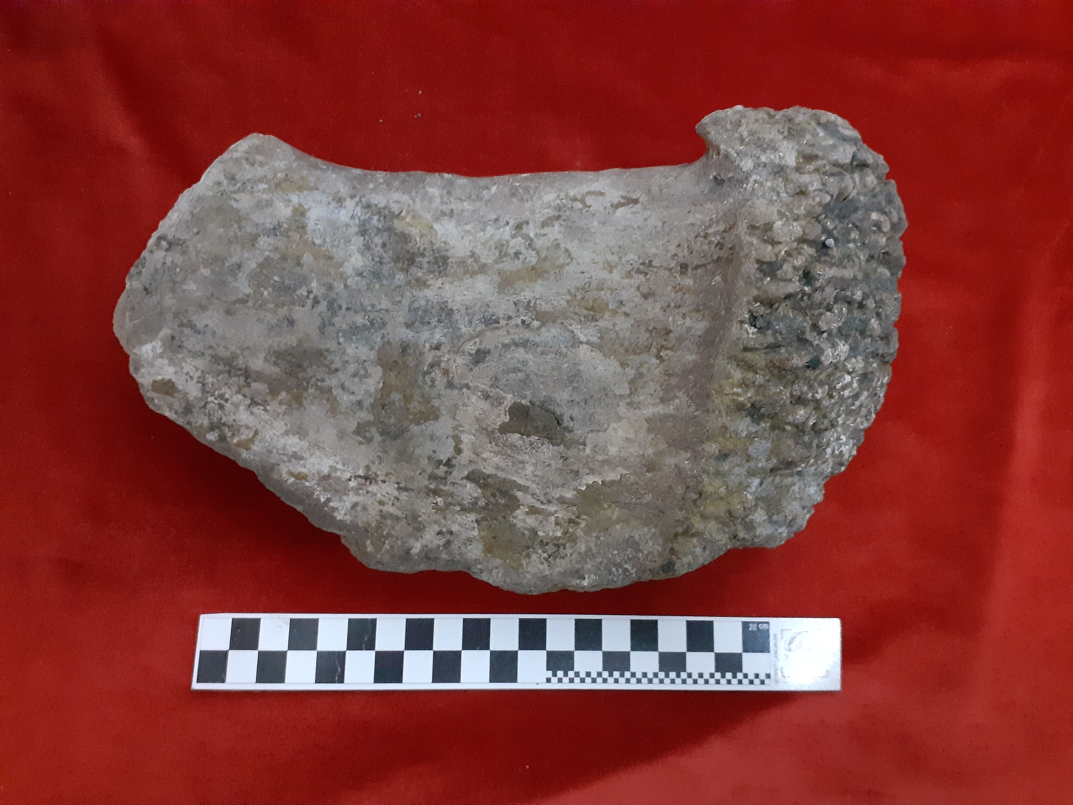 Warna putih berkarat, dan telah dicat kembali, berbentuk bulat panjang, bagian belakang bersirip empat, sebelah atas ada gantungan, samping kiri kanan berlubang, warna biru sudah memudar.