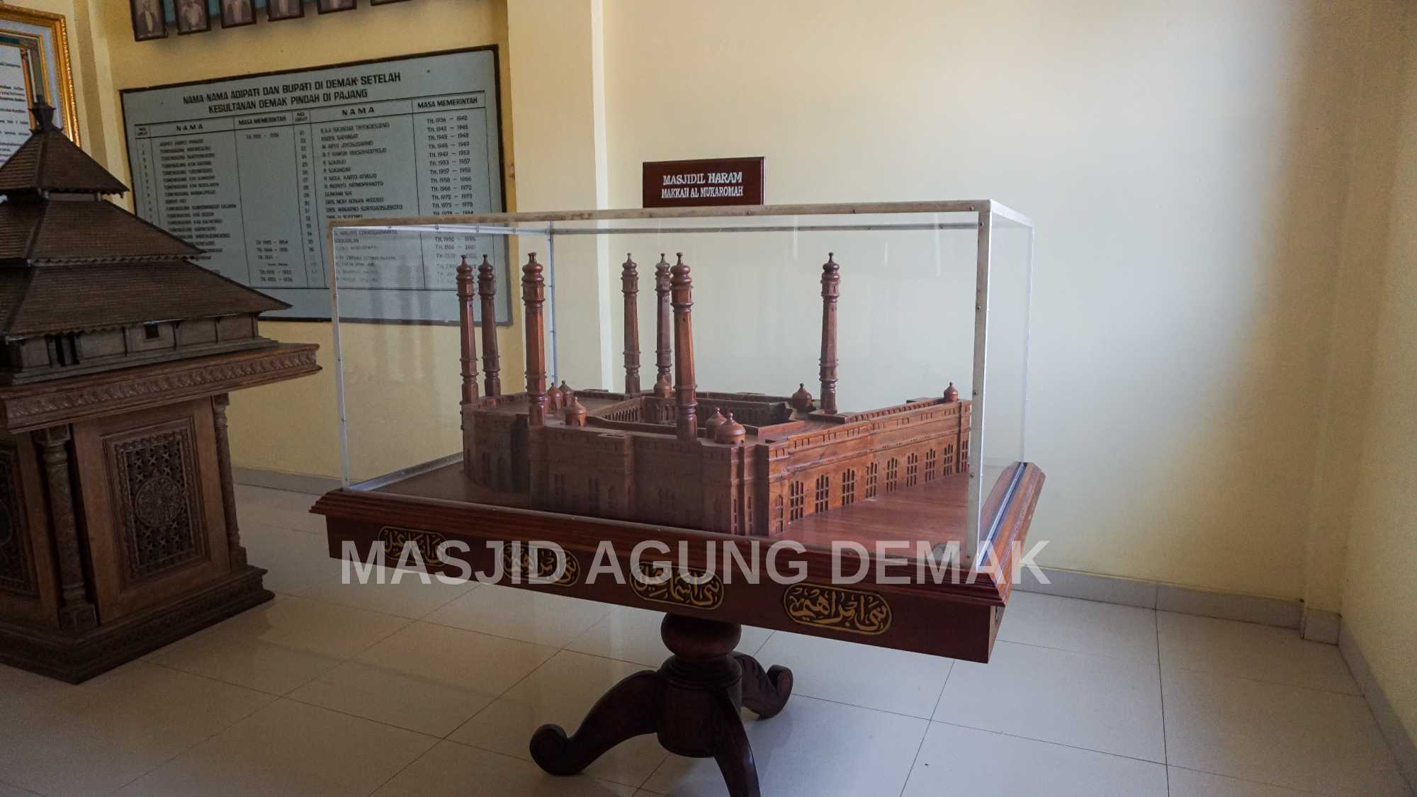 miniatur replika Masjidil Haram di Mekah, yang dibuat sepenuhnya dari bahan kayu, menampilkan sentuhan seni ukir dan ketelitian pengerjaan yang tinggi. Maket ini diletakkan di atas meja kayu khusus yang dihiasi ornamen kaligrafi Arab di bagian sisinya. Untuk melindungi dari debu dan kerusakan, maket ditutup dengan kotak kaca transparan, memungkinkan pengunjung melihat secara jelas dari segala sisi.