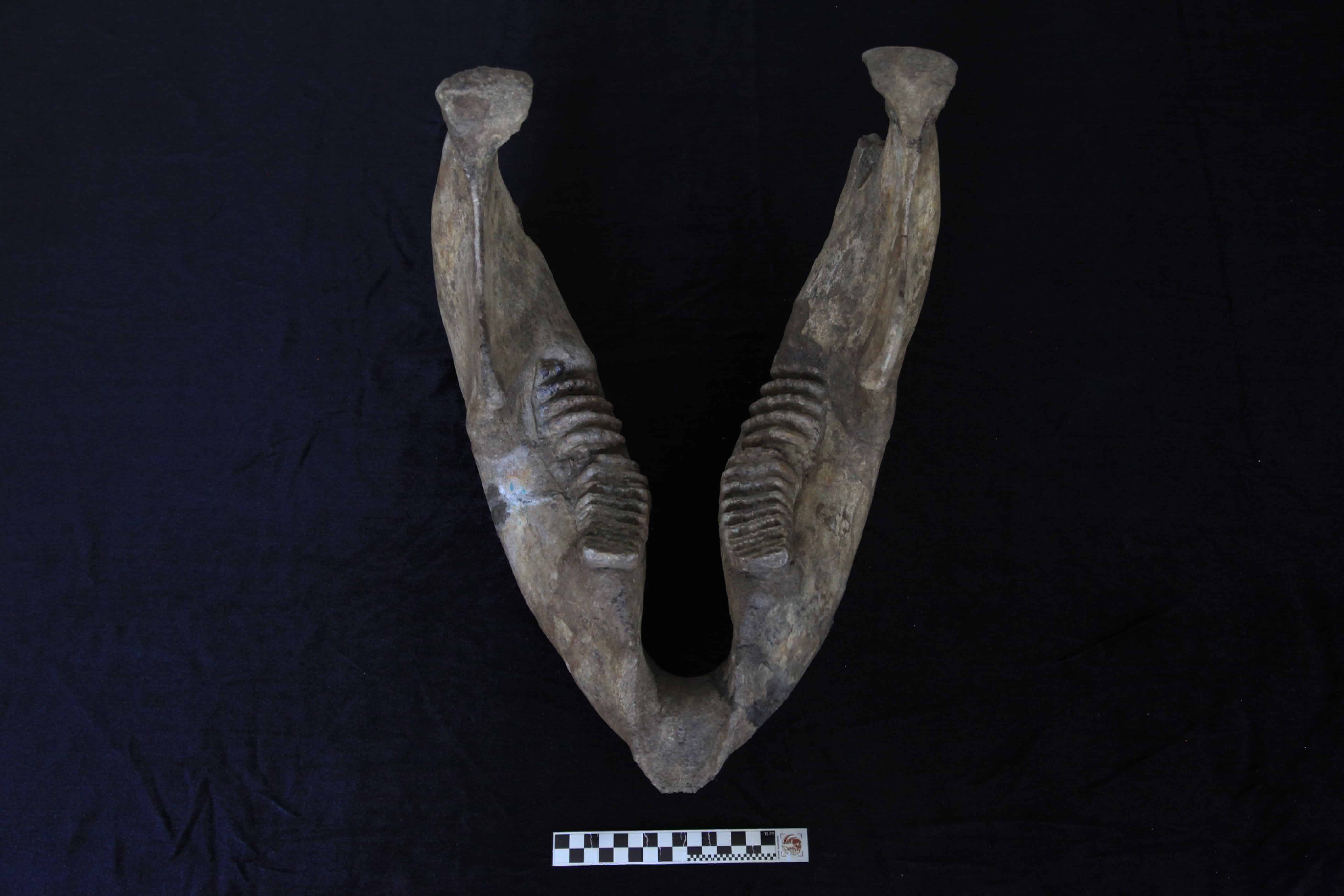 Rahang bawah gajah purba jenis Stegodon sp. ini dalam kondisi utuh dilengkapi dengan molar dikedua sisi kiri dan kanan rahang. Gigi molar pada Stegodon bertipe brachyodont dan lopodont. Brachyodont merupakan tipe gigi dengan mahkota rendah, sedangkan lopodont merupakan tipe molar dengan puncak mahkota berbentuk barisan punggungan lurus. Rahang ini berwarna kecoklatan dengan gigi geraham berwarna keabuan.