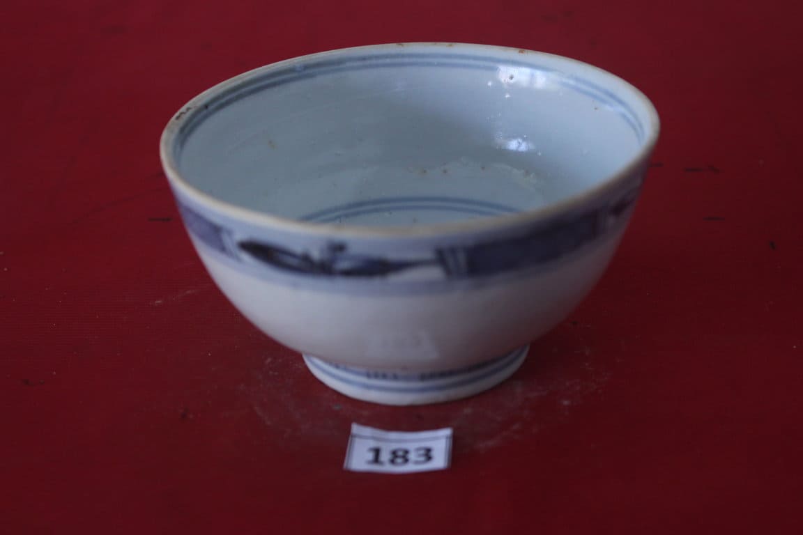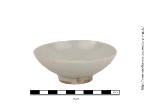 Salah satu penghasil keramik terbesar dari Dinasti Han hingga Dinasti Qing adalah mangkuk. Pada masa Dinasti Qing, banyak diproduksi berbagai jenis keramik, termasuk mangkuk. Mangkuk ini disimpan di museum sebagai benda warisan budaya yang dapat dilestarikan. Terbuat dari porselen kasar yang dicampur silikon, mangkuk ini dibentuk menggunakan teknik roda pelarik dan dibakar dalam tungku keramik pada suhu sekitar 1200°C. Mangkuk ini berbentuk bundar dengan dinding melengkung seperti huruf C dan lingkaran kaki yang agak tinggi. Glasirnya berwarna biru, dan dinding luar terdapat pori-pori seperti tusukan jarum akibat perbedaan suhu saat pembakaran. Dinding luar juga dihiasi dengan motif garis lingkaran. Mangkuk ini digunakan sebagai tempat makanan.