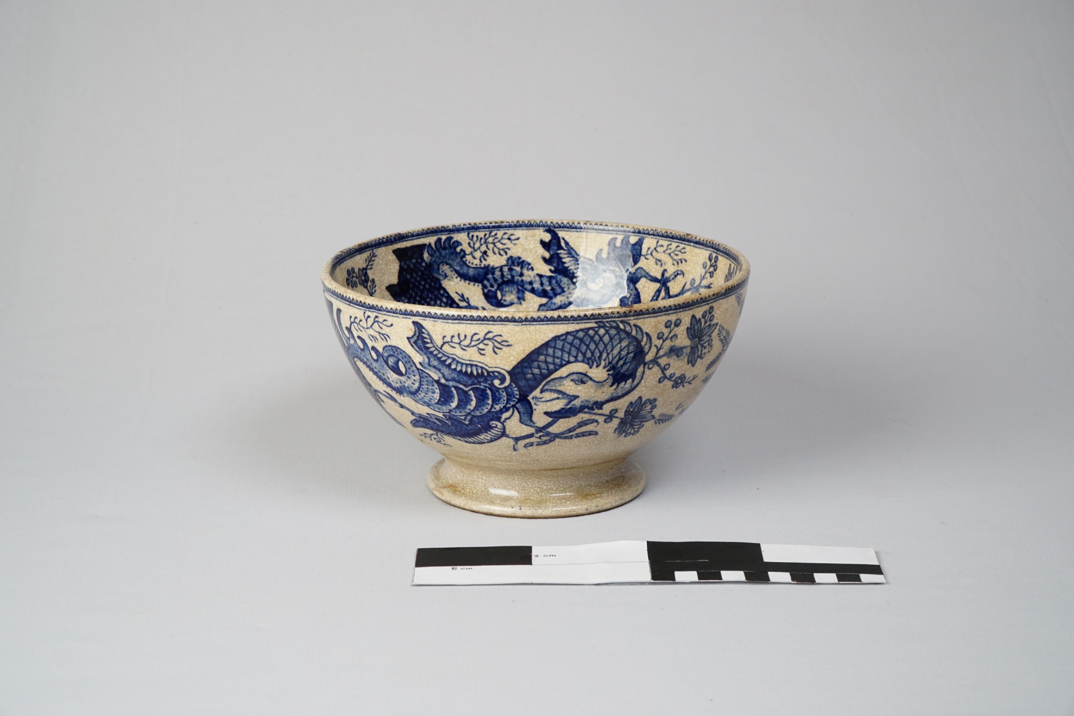 Mangkuk keramik putih biru, pecah seribu serta berkaki piala rendah dan melingkar. Mangkuk berstempel nama pola yaitu DRAGON. Bukan hanya naga, mangkuk juga dihias motif bangunan, flora dan bentuk geometris di bagian luar bibir mangkuk. Berdasarkan stempel perusahaan yang diterakan, diperkirakan diproduksi pada 1880.
