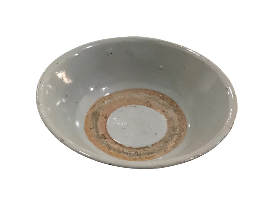Terbuat dari tanah liat dengan bentuk bundar. Memiliki glasir putih keabuan, lingkaran pusat tidak terglasir sempurna, terdapat jejak tumpukan dengan lingkaran yang tidak berglasir. terdapat sisa sisa proses pembuatan keramik di bagian tengah keramik. Pada lingkaran badan bagian luar terdapat motif rangkaian daun warna hitam keabuan. Bagian dasar memiliki kaki cukup tinggi dengan lingkaran tidak berglasir. Mangkuk ini digunakan sebagai wadah tempat makanan. Diperkirakan dibuat di Cina pada masa Dinasti Qing (abad 19 - 20 masehi).