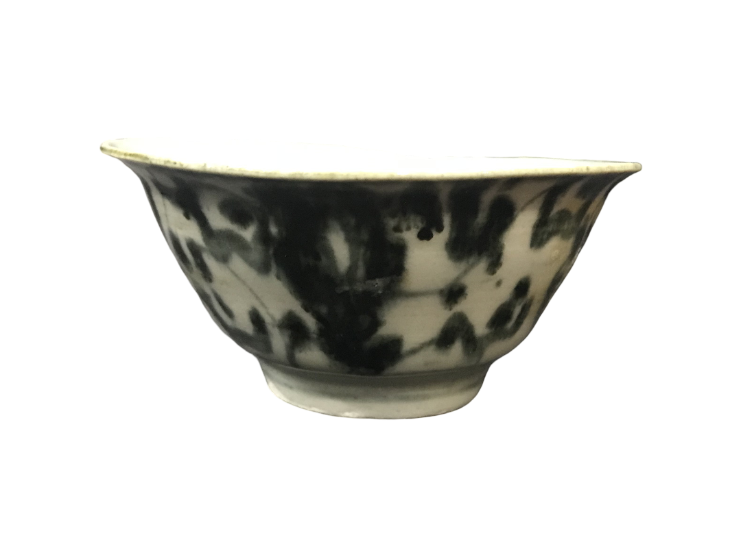 Mangkuk ini terbuat dari tanah liat kaolin yang dilapisi dengan porselin sebagai bahan pengilat yang berwarna biru muda. Mangkuk ini berbentuk cekung dengan permukaan mulut lebar dan lingkaran kaki rendah. Pada bagian dalam mangkuk, terdapat garis-garis lingkaran yang fungsinya sebagai hiasan sedangkan bahagian luarnya terdapat hiasan yang bermotifkan kelok-kelok paku. Fungsi mangkuk ini sebagai wadah. Mangkukini merupakan peralatan rumah tangga yang dipergunakan untuk tempat meletakkan makanan yang berkuah seperti bubur, lauk-pauk dan lain-lain. biasanya ditemukan pada dinasti han sekitar 206SM-220M dan puncaknya selama dinasti ming dan qing