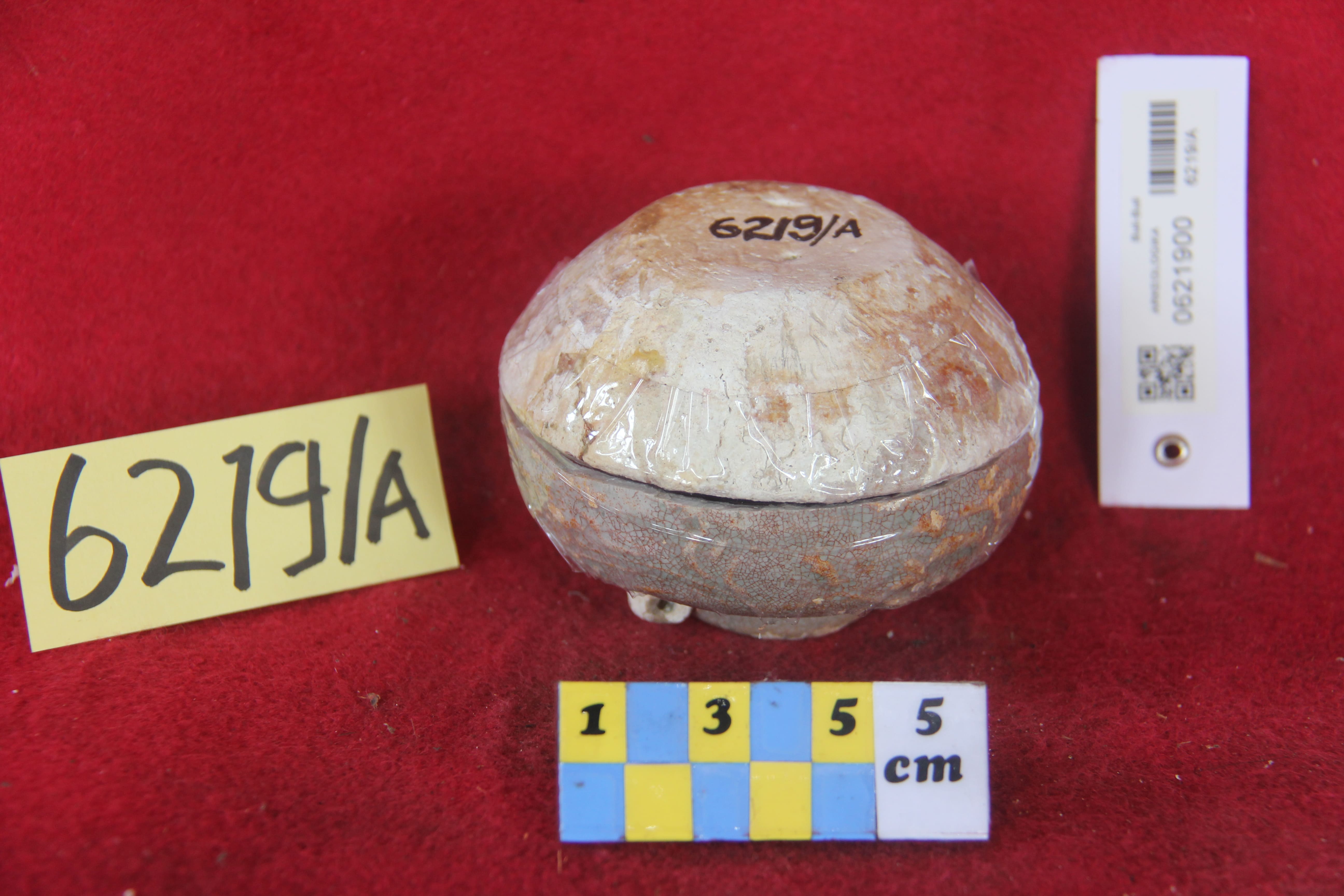Berbentuk mangkuk berbahan kaolin yang diglasir dengan warna putih biru. Motif mangkuk terdapat pada bibir, dasar dan badan. Motif padat pada bagian dasar dan badan mangkuk. Teknik pembuatan menggunakan roda pemutar.