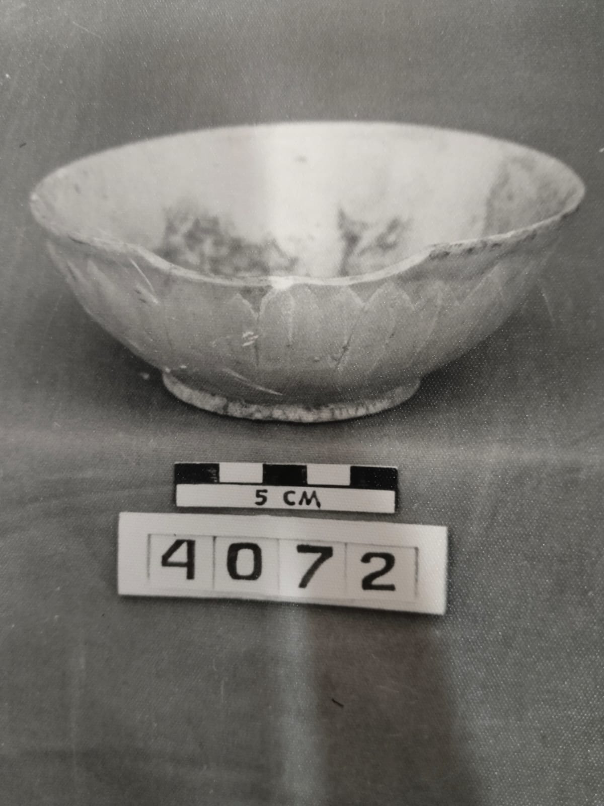 Bahan Kaolin pada bagian luar terdapat garis simmetris dengan hiasan pola hias bungan dan daun pada sisi dalam terdapat hiasan bunga pada bagian bibir dalam terdapat pola hias lingkaran benda ini diperkirakan pada dinasi ing fungsinya sebagai wadah.