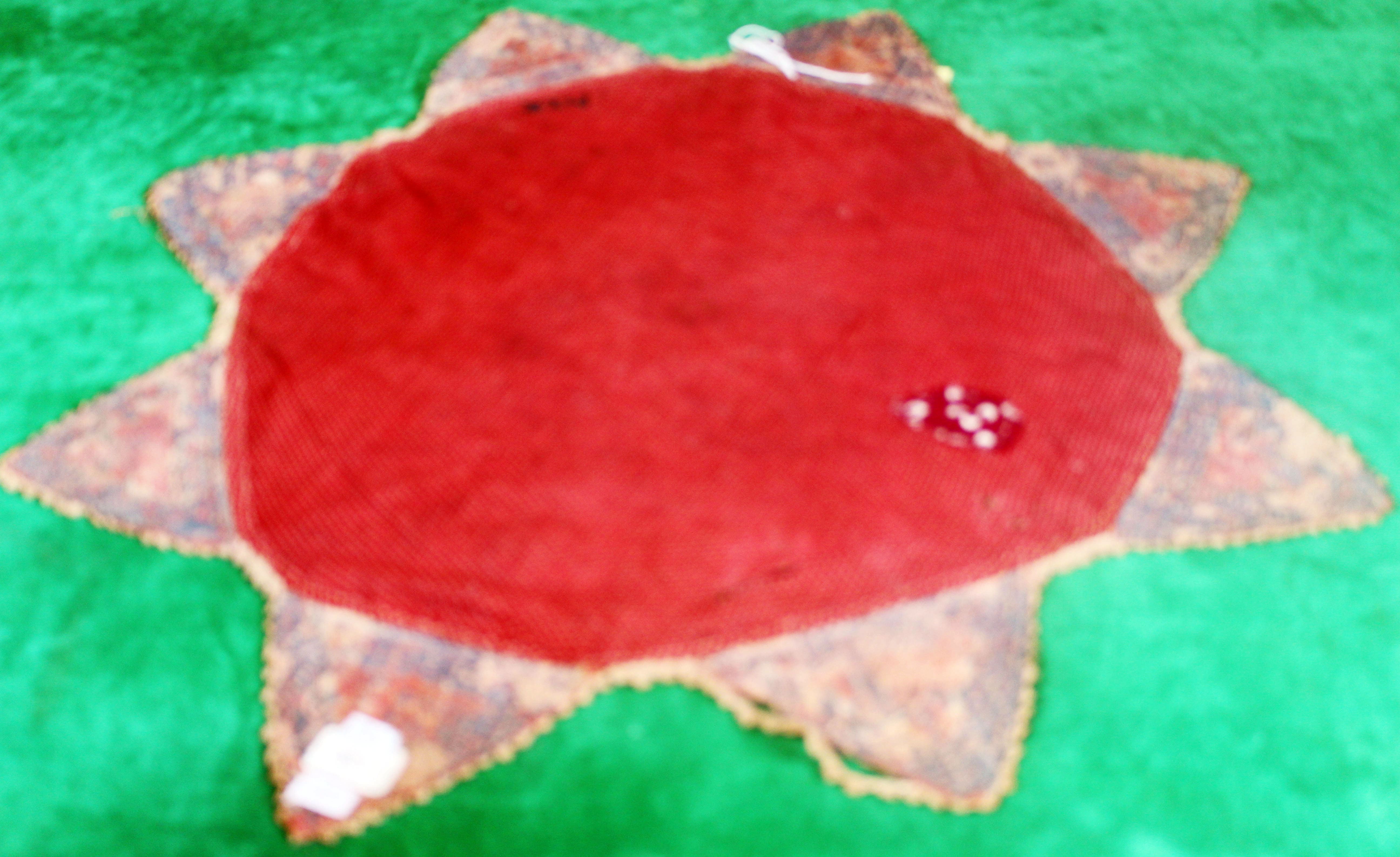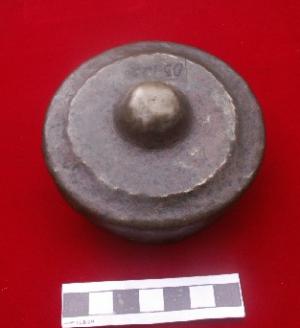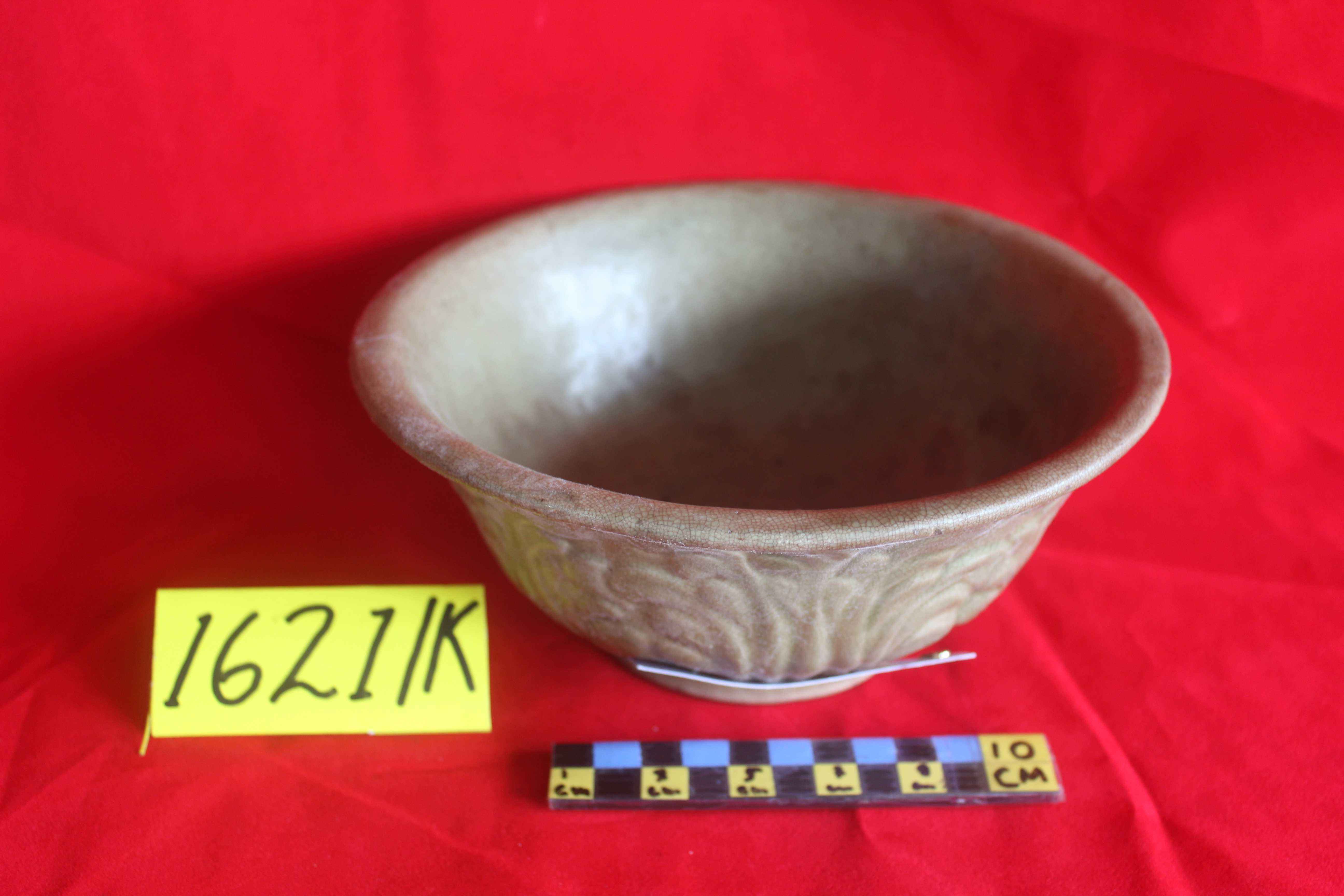 Terbuat dari tanah liat, bentuk bulat cekung, glasir warna kehijauan, retak seribu, motif enam rumpun bunga timbul. Pada kaki dan dasar tidak diglasir. Cina, Dinasti Sung abad 14 M.