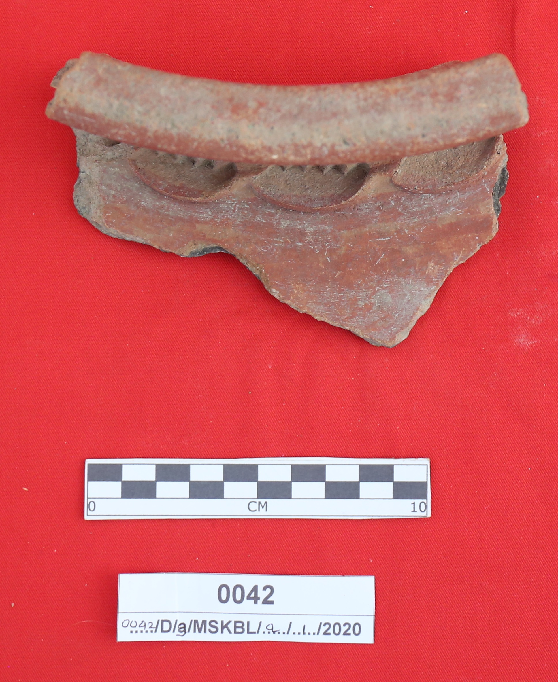 Terbuat dari tanah liat , bentuk bulat cekung dan berkaki, berglasir warna abu-abu. Bibir rata membalik ke dalam dan sompel satu bagian. Pada bagian tengah atas terdapat cap motif bunga di dalam lingkaran biskwit, dinding atas dan bawah polos. Dasar bawah rata tanpa glasir. Ketika ditemukan seluruh permukaan atas dan bawah tertutup karang laut tebal. Cina, Dinasti Sung abad 10-13 M.