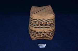 Terbuat dari tanah liat, bentuk bulat cekung dan berkaki, berglasir warna abu-abu. Bibir rata tanpa glasir dan sompel / pecah dua bagian, pada bagian tengah / dasar atas terdapat cap motif flora di dalam lingkaran biskwit, dinding terdapat garis-garis melingkar tipis dan terdapat bercak-bercak hitam, dasar bawah rata tanpa glasir. Cina, Dinasti Sung abad 10-13 M.